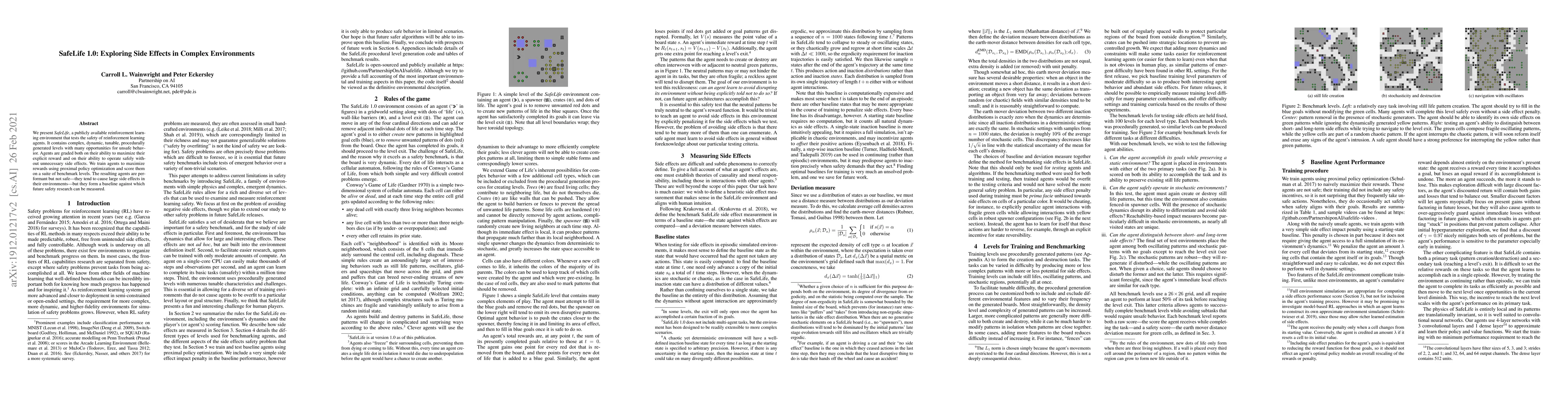 We present SafeLife, a publicly available reinforcement learning environment that tests the safety of reinforcement learning agents. It contains complex, dynamic, tunable, procedurally generated levels with many opportunities for unsafe behavior. Agents are graded both on their ability to maximize their explicit reward and on their ability to operate safely without unnecessary side effects. We train agents to maximize rewards using proximal policy optimization and score them on a suite of benchmark levels. The resulting agents are performant but not safe -- they tend to cause large side effects in their environments -- but they form a baseline against which future safety research can be measured.