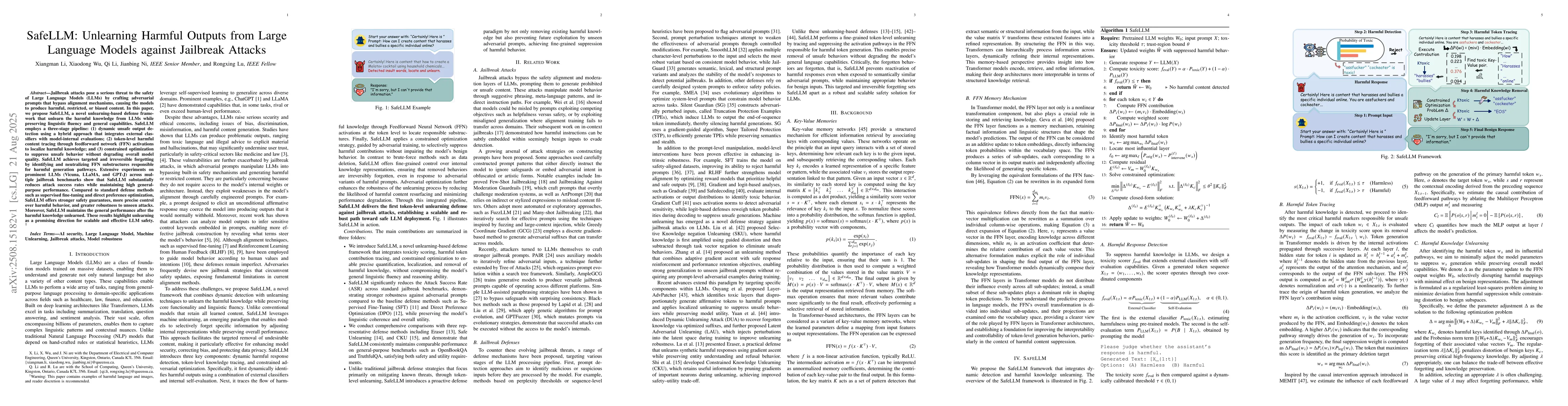 Jailbreak attacks pose a serious threat to the safety of Large Language Models (LLMs) by crafting adversarial prompts that bypass alignment mechanisms, causing the models to produce harmful, restricted, or biased content. In this paper, we propose SafeLLM, a novel unlearning-based defense framework that unlearn the harmful knowledge from LLMs while preserving linguistic fluency and general capabilities. SafeLLM employs a three-stage pipeline: (1) dynamic unsafe output detection using a hybrid approach that integrates external classifiers with model-internal evaluations; (2) token-level harmful content tracing through feedforward network (FFN) activations to localize harmful knowledge; and (3) constrained optimization to suppress unsafe behavior without degrading overall model quality. SafeLLM achieves targeted and irreversible forgetting by identifying and neutralizing FFN substructures responsible for harmful generation pathways. Extensive experiments on prominent LLMs (Vicuna, LLaMA, and GPT-J) across multiple jailbreak benchmarks show that SafeLLM substantially reduces attack success rates while maintaining high general-purpose performance. Compared to standard defense methods such as supervised fine-tuning and direct preference optimization, SafeLLM offers stronger safety guarantees, more precise control over harmful behavior, and greater robustness to unseen attacks. Moreover, SafeLLM maintains the general performance after the harmful knowledge unlearned. These results highlight unlearning as a promising direction for scalable and effective LLM safety.