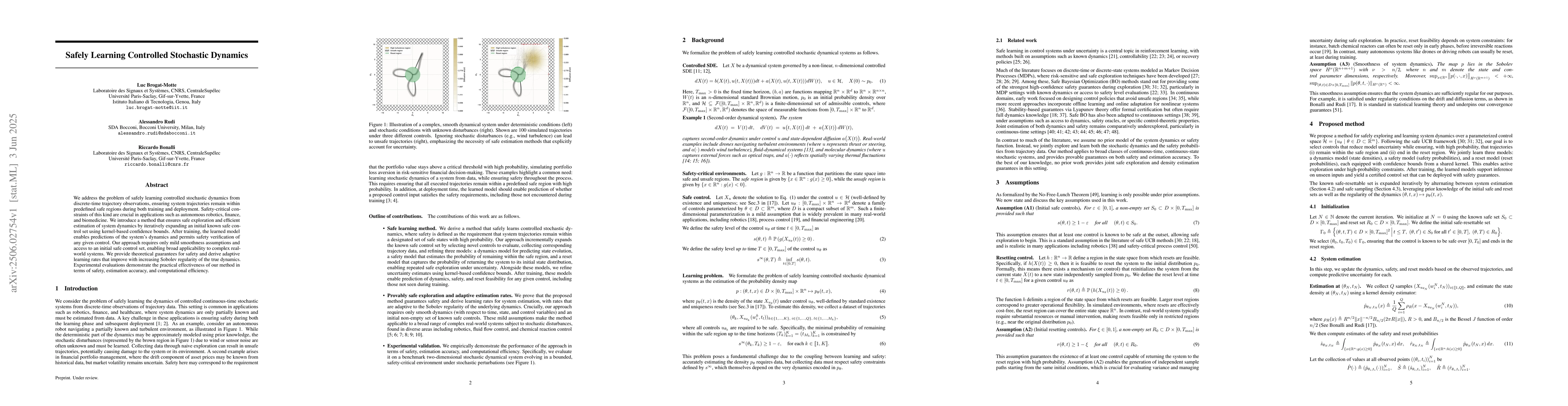 This research is crucial for safety-critical applications like autonomous robotics, finance, and biomedicine by enabling the learning of controlled stochastic dynamics while guaranteeing system trajectories remain within predefined safe regions.