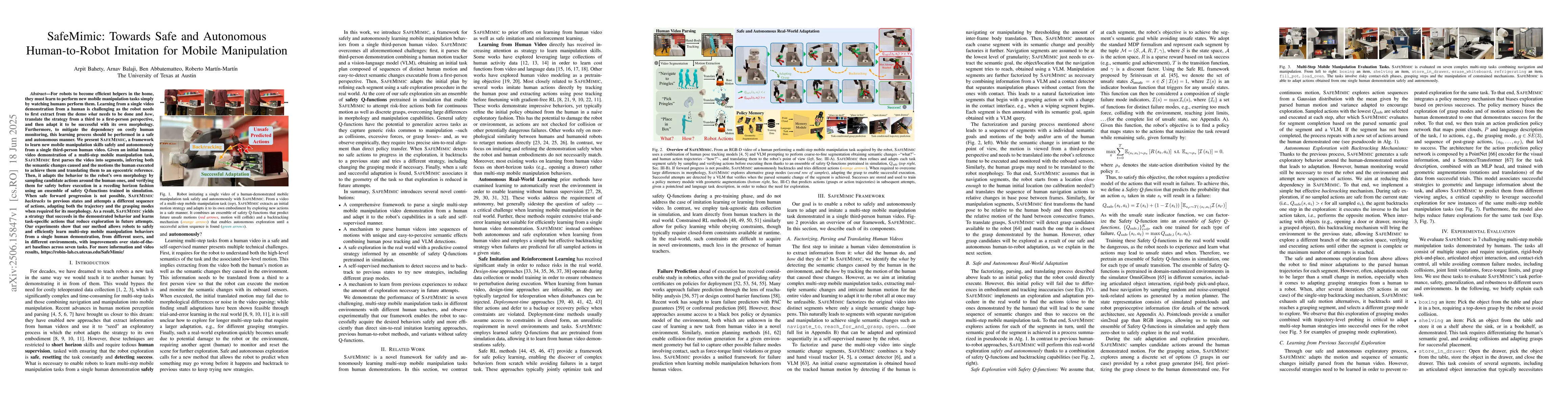 SafeMimic is a framework enabling robots to learn new mobile manipulation tasks autonomously from a single third-person human video demonstration. It parses human actions, adapts them to the robot's morphology safely, and learns task-specific actions for efficient future performance across various tasks and environments.