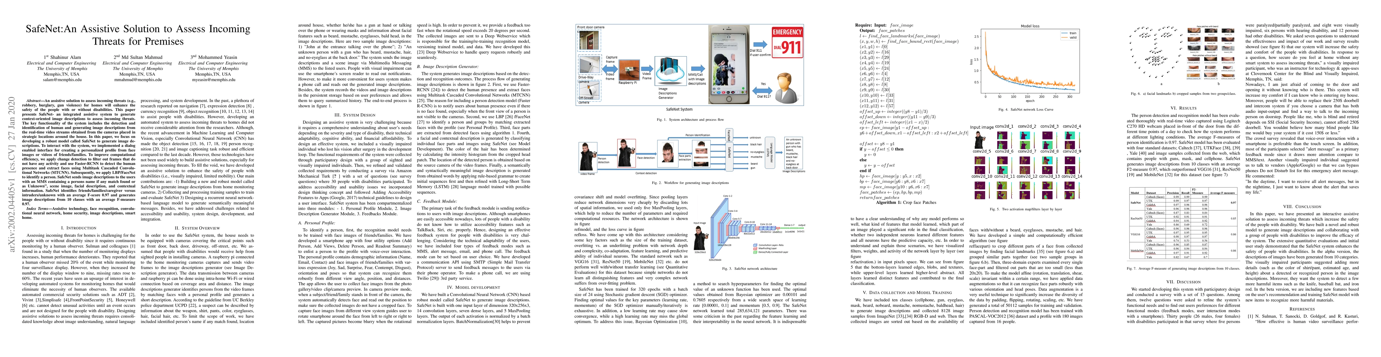 An assistive solution to assess incoming threats (e.g., robbery, burglary, gun violence) for homes will enhance the safety of the people with or without disabilities. This paper presents "SafeNet"- an integrated assistive system to generate context-oriented image descriptions to assess incoming threats. The key functionality of the system includes the detection and identification of human and generating image descriptions from the real-time video streams obtained from the cameras placed in strategic locations around the house. In this paper, we focus on developing a robust model called "SafeNet" to generate image descriptions. To interact with the system, we implemented a dialog enabled interface for creating a personalized profile from face images or videos of friends/families. To improve computational efficiency, we apply change detection to filter out frames that do not have any activity and use Faster-RCNN to detect the human presence and extract faces using Multitask Cascaded Convolutional Networks (MTCNN). Subsequently, we apply LBP/FaceNet to identify a person. SafeNet sends image descriptions to the users with an MMS containing a person's name if any match found or as "Unknown", scene image, facial description, and contextual information. SafeNet identifies friends/families/caregiver versus intruders/unknown with an average F-score 0.97 and generates image descriptions from 10 classes with an average F-measure 0.97.