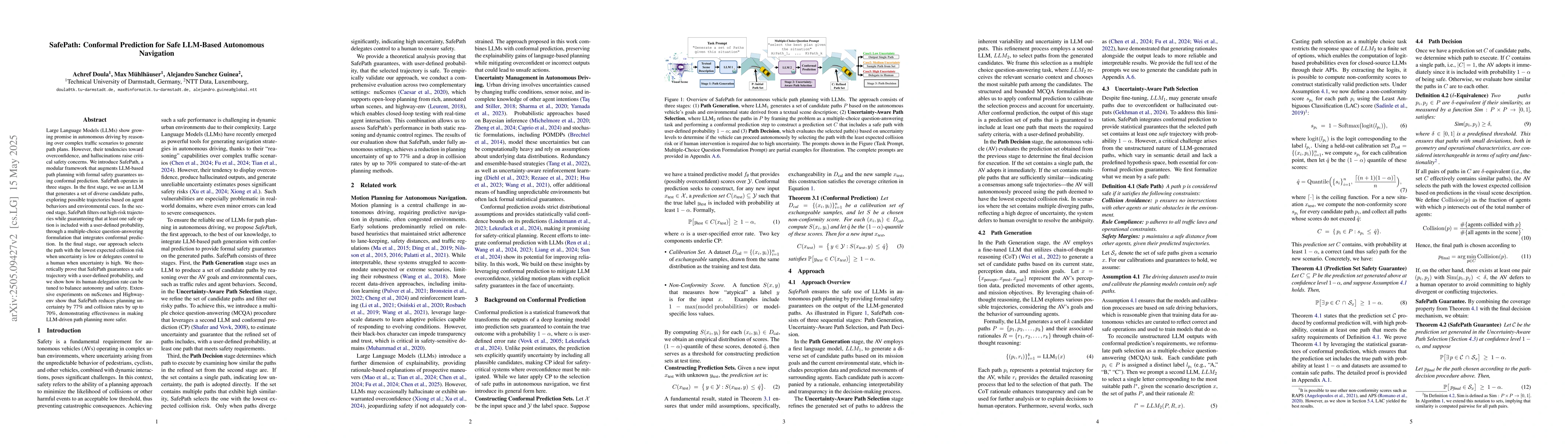 SafePath introduces a conformal prediction-based approach to provide formal safety guarantees for LLM-driven autonomous navigation, ensuring at least one safe path with a user-defined probability.