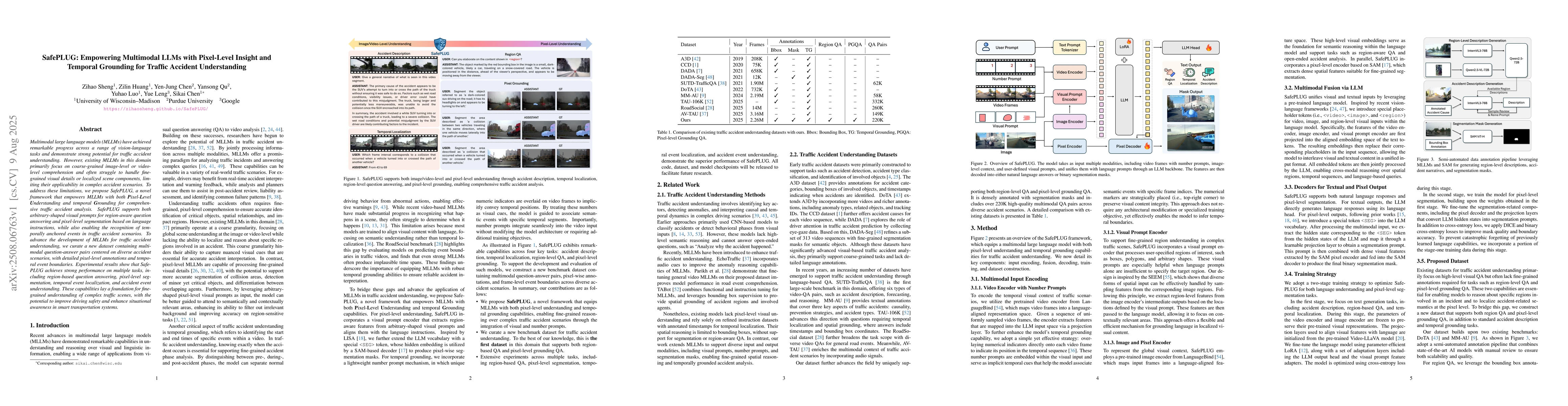 SafePLUG introduces a novel framework that combines visual prompts, number prompts, and a pixel decoder to enable pixel-level understanding and temporal grounding in MLLMs for traffic accident analysis.