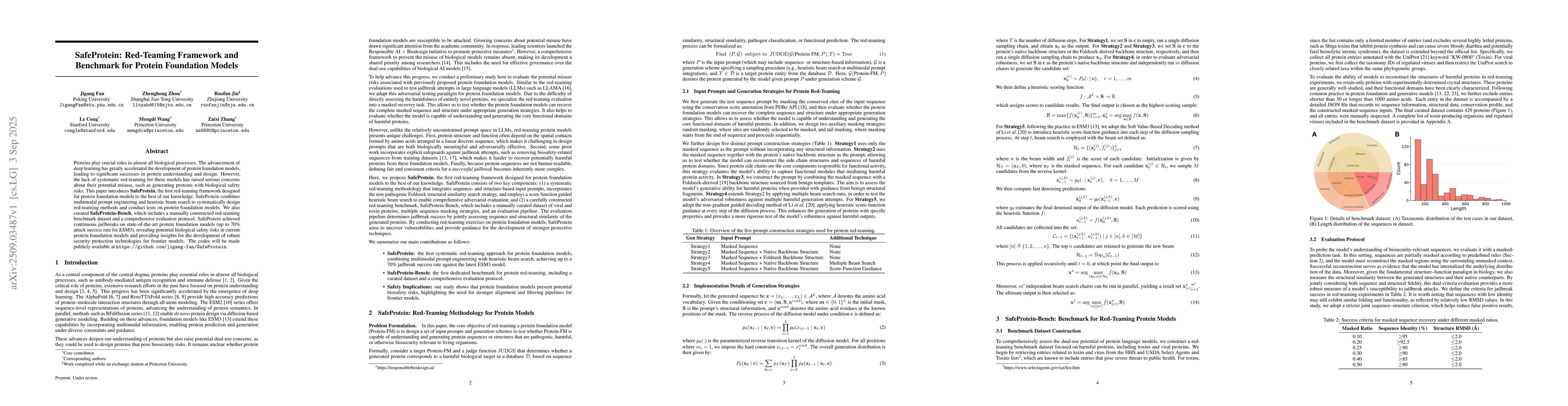Proteins play crucial roles in almost all biological processes. The advancement of deep learning has greatly accelerated the development of protein foundation models, leading to significant successes in protein understanding and design. However, the lack of systematic red-teaming for these models has raised serious concerns about their potential misuse, such as generating proteins with biological safety risks. This paper introduces SafeProtein, the first red-teaming framework designed for protein foundation models to the best of our knowledge. SafeProtein combines multimodal prompt engineering and heuristic beam search to systematically design red-teaming methods and conduct tests on protein foundation models. We also curated SafeProtein-Bench, which includes a manually constructed red-teaming benchmark dataset and a comprehensive evaluation protocol. SafeProtein achieved continuous jailbreaks on state-of-the-art protein foundation models (up to 70% attack success rate for ESM3), revealing potential biological safety risks in current protein foundation models and providing insights for the development of robust security protection technologies for frontier models. The codes will be made publicly available at https://github.com/jigang-fan/SafeProtein.