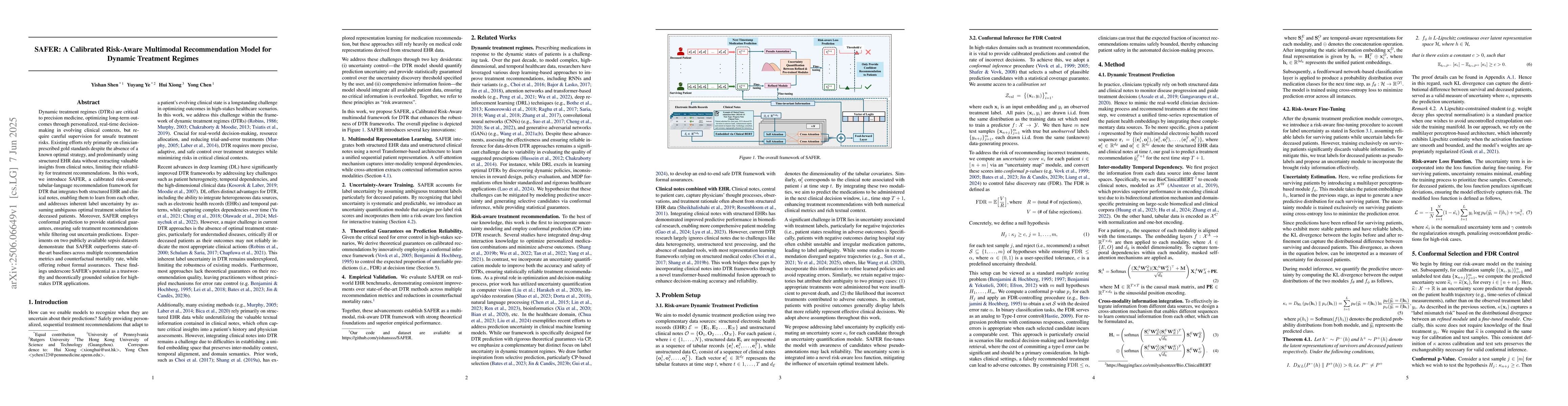 Dynamic treatment regimes (DTRs) are critical to precision medicine, optimizing long-term outcomes through personalized, real-time decision-making in evolving clinical contexts, but require careful supervision for unsafe treatment risks. Existing efforts rely primarily on clinician-prescribed gold standards despite the absence of a known optimal strategy, and predominantly using structured EHR data without extracting valuable insights from clinical notes, limiting their reliability for treatment recommendations. In this work, we introduce SAFER, a calibrated risk-aware tabular-language recommendation framework for DTR that integrates both structured EHR and clinical notes, enabling them to learn from each other, and addresses inherent label uncertainty by assuming ambiguous optimal treatment solution for deceased patients. Moreover, SAFER employs conformal prediction to provide statistical guarantees, ensuring safe treatment recommendations while filtering out uncertain predictions. Experiments on two publicly available sepsis datasets demonstrate that SAFER outperforms state-of-the-art baselines across multiple recommendation metrics and counterfactual mortality rate, while offering robust formal assurances. These findings underscore SAFER potential as a trustworthy and theoretically grounded solution for high-stakes DTR applications.