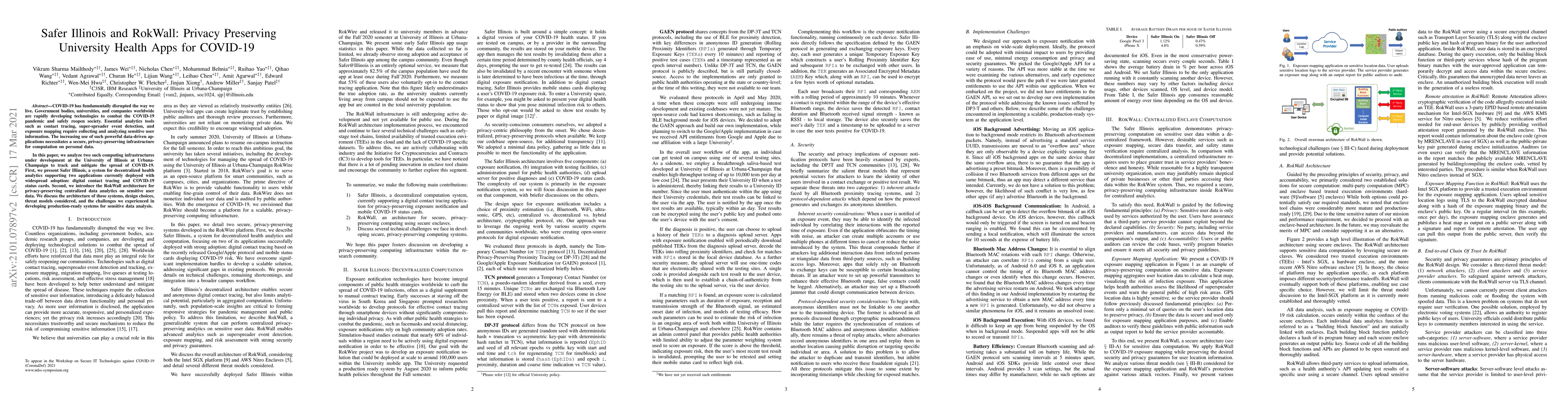This paper examines two privacy-preserving health analytics systems developed by the University of Illinois to combat COVID-19: Safer Illinois for decentralized contact tracing and RokWall for centralized data analytics. It discusses their architectures, design choices, and the challenges faced in creating secure systems for sensitive data analysis.