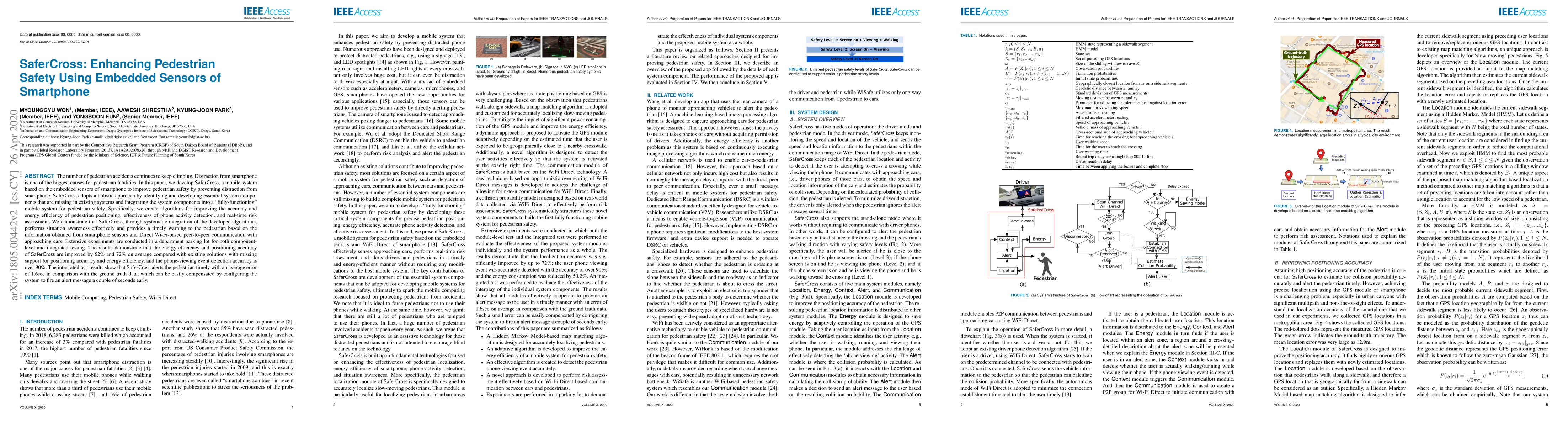 SaferCross is a mobile system leveraging smartphone sensors to enhance pedestrian safety by mitigating smartphone-related distractions. It integrates improved algorithms for positioning, activity detection, and risk assessment, achieving significant gains in efficiency and accuracy, and providing timely warnings to pedestrians.