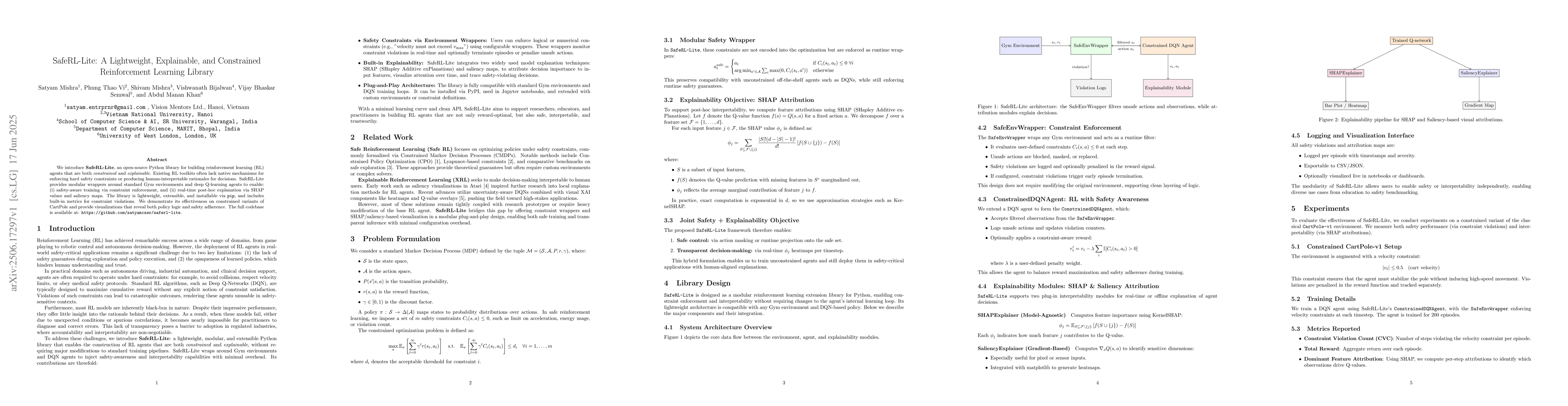 We introduce SafeRL-Lite, an open-source Python library for building reinforcement learning (RL) agents that are both constrained and explainable. Existing RL toolkits often lack native mechanisms for enforcing hard safety constraints or producing human-interpretable rationales for decisions. SafeRL-Lite provides modular wrappers around standard Gym environments and deep Q-learning agents to enable: (i) safety-aware training via constraint enforcement, and (ii) real-time post-hoc explanation via SHAP values and saliency maps. The library is lightweight, extensible, and installable via pip, and includes built-in metrics for constraint violations. We demonstrate its effectiveness on constrained variants of CartPole and provide visualizations that reveal both policy logic and safety adherence. The full codebase is available at: https://github.com/satyamcser/saferl-lite.