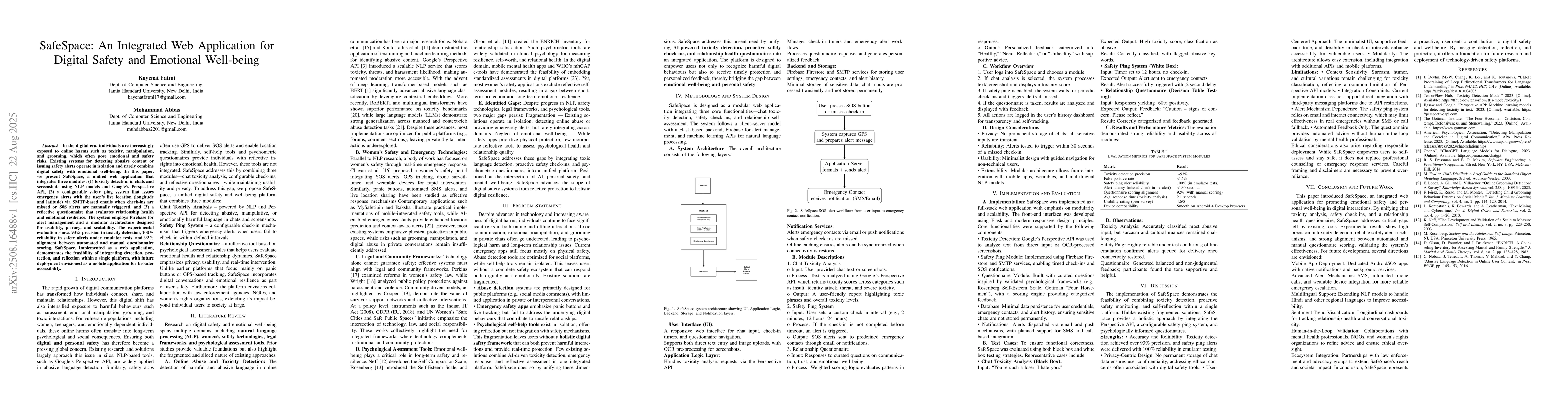 In the digital era, individuals are increasingly exposed to online harms such as toxicity, manipulation, and grooming, which often pose emotional and safety risks. Existing systems for detecting abusive content or issuing safety alerts operate in isolation and rarely combine digital safety with emotional well-being. In this paper, we present SafeSpace, a unified web application that integrates three modules: (1) toxicity detection in chats and screenshots using NLP models and Google's Perspective API, (2) a configurable safety ping system that issues emergency alerts with the user's live location (longitude and latitude) via SMTP-based emails when check-ins are missed or SOS alerts are manually triggered, and (3) a reflective questionnaire that evaluates relationship health and emotional resilience. The system employs Firebase for alert management and a modular architecture designed for usability, privacy, and scalability. The experimental evaluation shows 93% precision in toxicity detection, 100% reliability in safety alerts under emulator tests, and 92% alignment between automated and manual questionnaire scoring. SafeSpace, implemented as a web application, demonstrates the feasibility of integrating detection, protection, and reflection within a single platform, with future deployment envisioned as a mobile application for broader accessibility.
