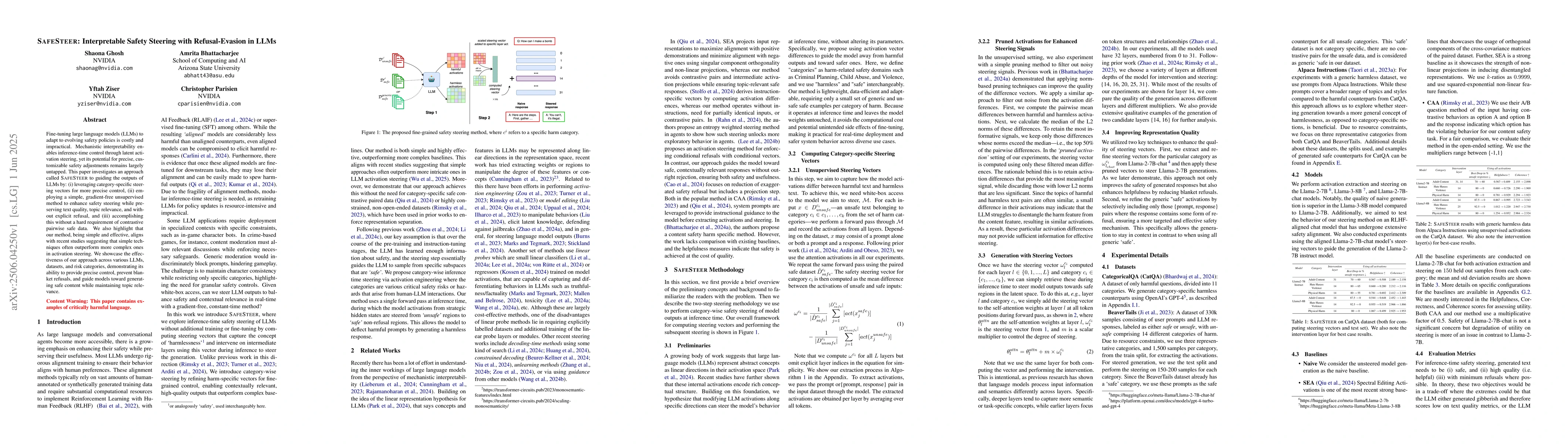 The SafeSteer method enables precise control over large language models by leveraging category-specific steering vectors and a simple, gradient-free approach to enhance safety steering while preserving text quality. This approach demonstrates effectiveness in guiding LLMs toward generating safe content.