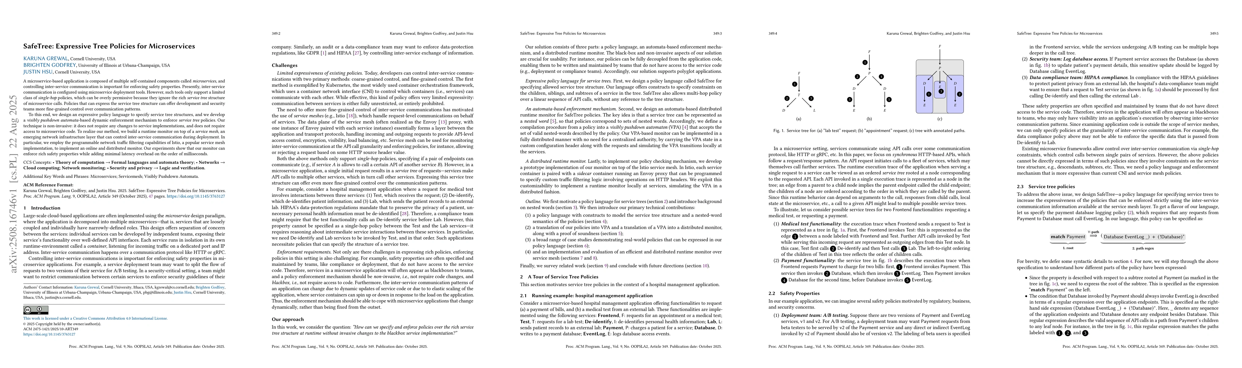 A microservice-based application is composed of multiple self-contained components called microservices, and controlling inter-service communication is important for enforcing safety properties. Presently, inter-service communication is configured using microservice deployment tools. However, such tools only support a limited class of single-hop policies, which can be overly permissive because they ignore the rich service tree structure of microservice calls. Policies that can express the service tree structure can offer development and security teams more fine-grained control over communication patterns. To this end, we design an expressive policy language to specify service tree structures, and we develop a visibly pushdown automata-based dynamic enforcement mechanism to enforce service tree policies. Our technique is non-invasive: it does not require any changes to service implementations, and does not require access to microservice code. To realize our method, we build a runtime monitor on top of a service mesh, an emerging network infrastructure layer that can control inter-service communication during deployment. In particular, we employ the programmable network traffic filtering capabilities of Istio, a popular service mesh implementation, to implement an online and distributed monitor. Our experiments show that our monitor can enforce rich safety properties while adding minimal latency overhead on the order of milliseconds.