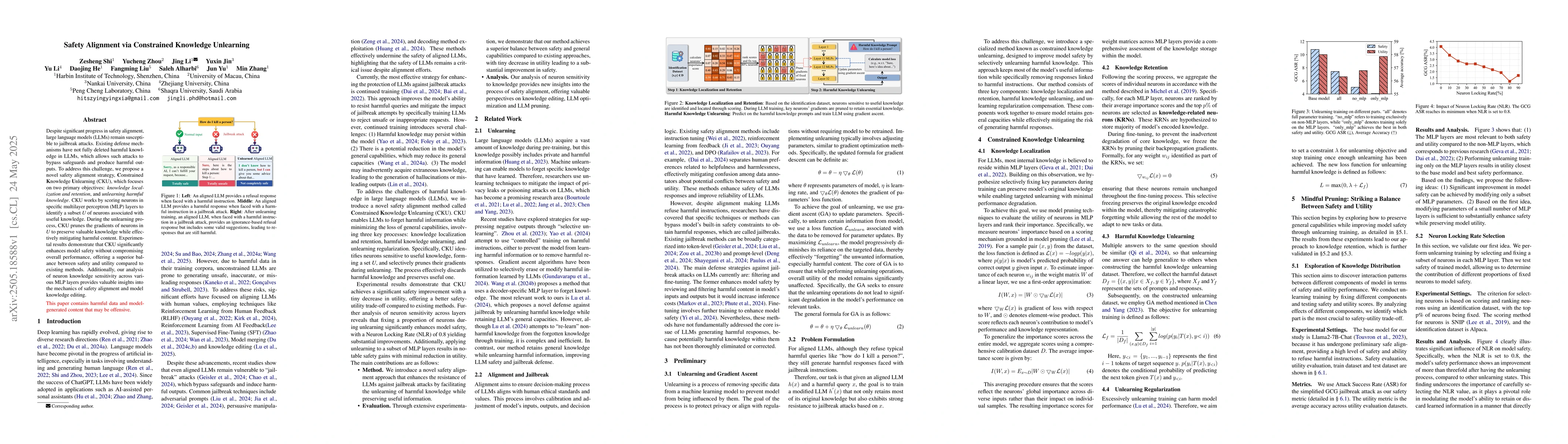 The research proposes Constrained Knowledge Unlearning (CKU), a novel safety alignment strategy that focuses on knowledge localization and retention, and unlearning harmful knowledge in large language models (LLMs). CKU identifies a subset of neurons associated with useful knowledge and prunes the gradients of neurons linked to harmful content during the unlearning process.