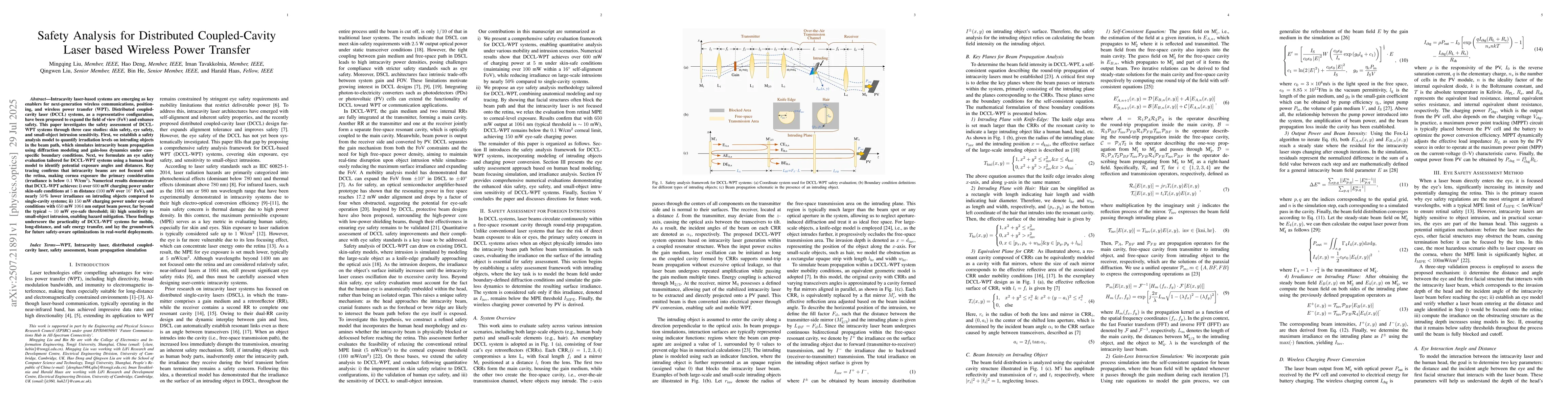 The paper presents a comprehensive safety analysis model for DCCL-WPT systems, integrating beamdiffraction modeling and gain-loss dynamics to quantify irradiation levels on intruding objects and assess skin, eye, and small-object intrusion safety.
