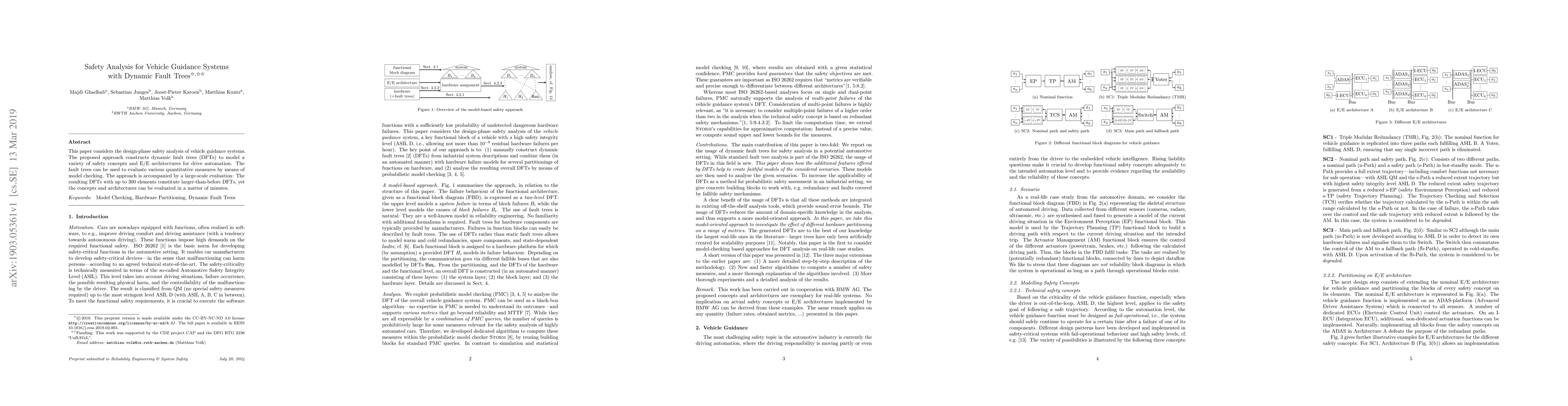 This paper proposes a design-phase safety analysis method for vehicle guidance systems using dynamic fault trees (DFTs) to model safety concepts and electronic/electrical architectures. The approach enables rapid evaluation of large-scale DFTs with up to 300 elements through model checking.