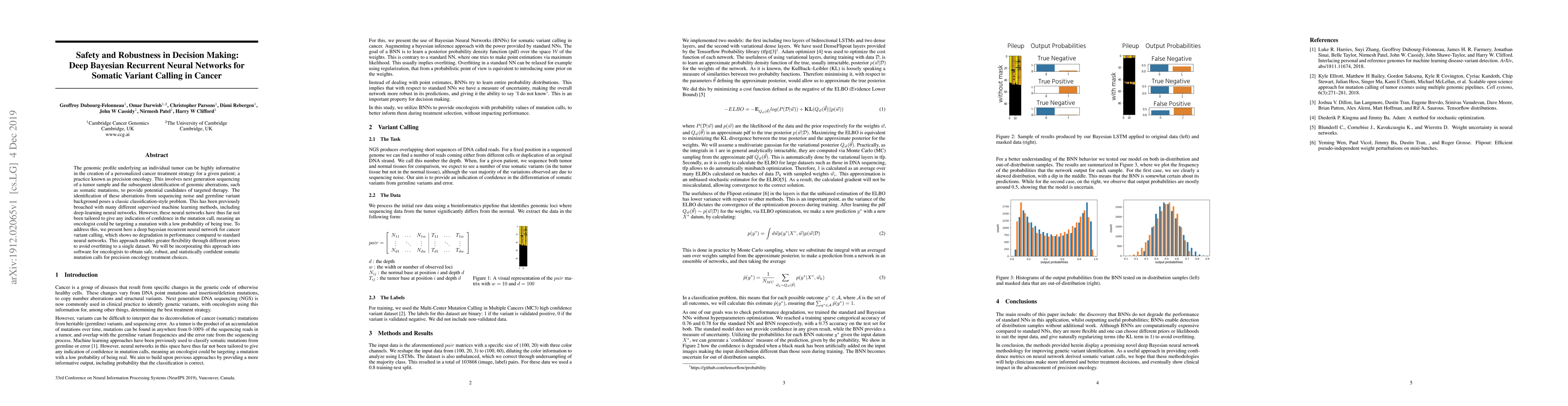 This paper introduces a deep Bayesian recurrent neural network for identifying somatic mutations in cancer genomic data, providing confidence measures for mutation calls. This approach aims to enhance precision oncology by offering safer, more robust, and statistically reliable variant calling compared to traditional neural networks.
