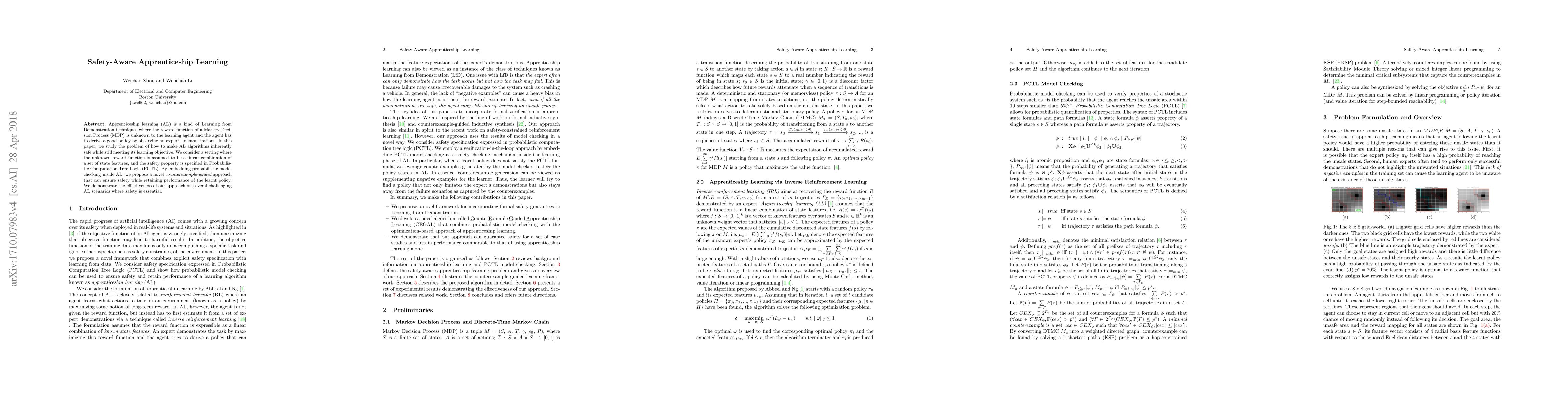 This paper proposes a novel safety-aware apprenticeship learning method that integrates probabilistic model checking to ensure safety in the learning process while maintaining the performance of the learned policy. The approach uses a probabilistic logic to specify safety properties and a counterexample-guided technique to balance safety and learning objectives.