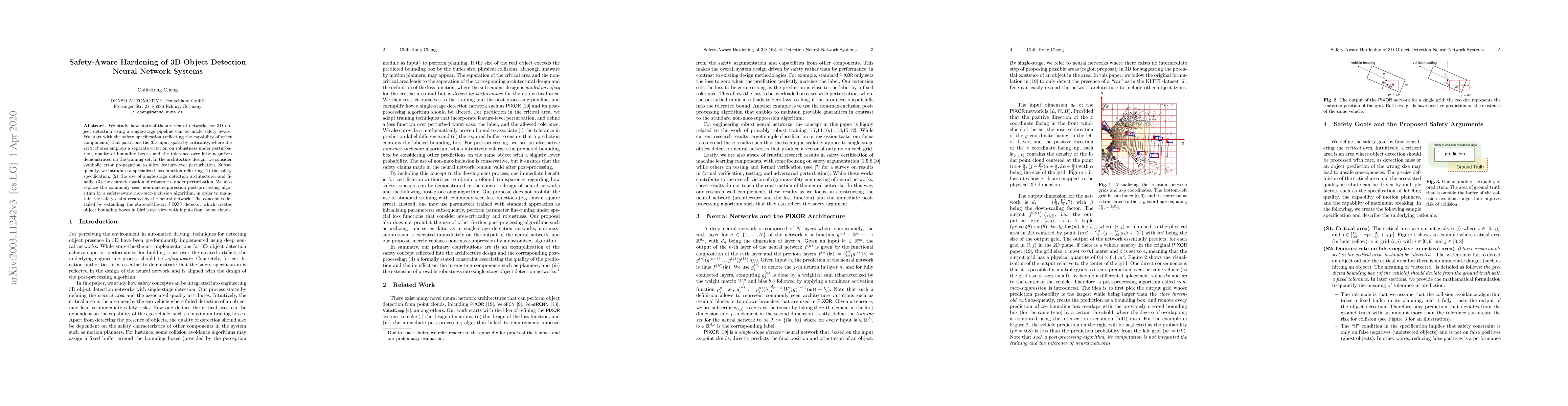 We study how state-of-the-art neural networks for 3D object detection using a single-stage pipeline can be made safety aware. We start with the safety specification (reflecting the capability of other components) that partitions the 3D input space by criticality, where the critical area employs a separate criterion on robustness under perturbation, quality of bounding boxes, and the tolerance over false negatives demonstrated on the training set. In the architecture design, we consider symbolic error propagation to allow feature-level perturbation. Subsequently, we introduce a specialized loss function reflecting (1) the safety specification, (2) the use of single-stage detection architecture, and finally, (3) the characterization of robustness under perturbation. We also replace the commonly seen non-max-suppression post-processing algorithm by a safety-aware non-max-inclusion algorithm, in order to maintain the safety claim created by the neural network. The concept is detailed by extending the state-of-the-art PIXOR detector which creates object bounding boxes in bird's eye view with inputs from point clouds.