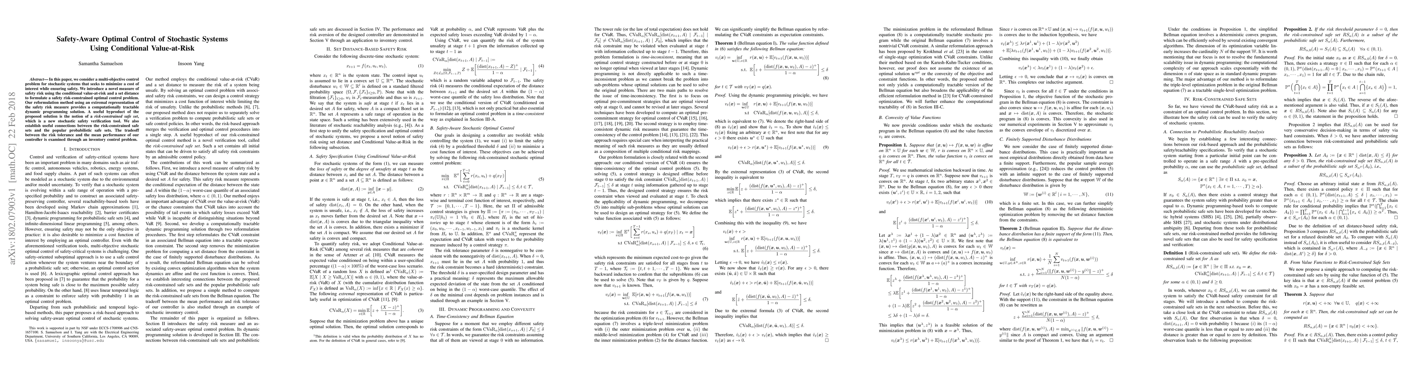 This paper proposes a novel safety-aware optimal control framework for stochastic systems using conditional value-at-risk to ensure safety while minimizing costs. The method introduces a risk-constrained safe set, offering a new verification tool, and demonstrates its effectiveness through an inventory control problem.