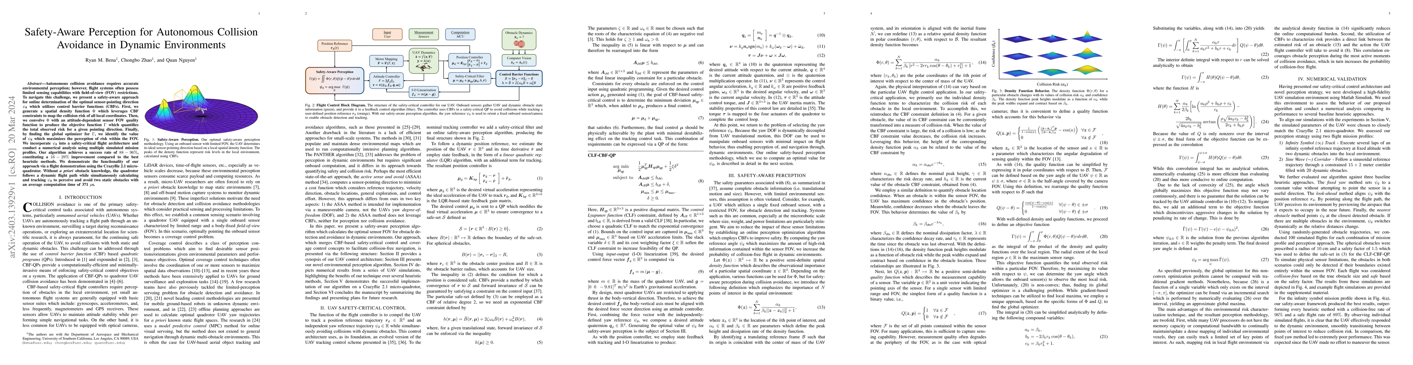 Autonomous collision avoidance requires accurate environmental perception; however, flight systems often possess limited sensing capabilities with field-of-view (FOV) restrictions. To navigate this challenge, we present a safety-aware approach for online determination of the optimal sensor-pointing direction $\psi_\text{d}$ which utilizes control barrier functions (CBFs). First, we generate a spatial density function $\Phi$ which leverages CBF constraints to map the collision risk of all local coordinates. Then, we convolve $\Phi$ with an attitude-dependent sensor FOV quality function to produce the objective function $\Gamma$ which quantifies the total observed risk for a given pointing direction. Finally, by finding the global optimizer for $\Gamma$, we identify the value of $\psi_\text{d}$ which maximizes the perception of risk within the FOV. We incorporate $\psi_\text{d}$ into a safety-critical flight architecture and conduct a numerical analysis using multiple simulated mission profiles. Our algorithm achieves a success rate of $88-96\%$, constituting a $16-29\%$ improvement compared to the best heuristic methods. We demonstrate the functionality of our approach via a flight demonstration using the Crazyflie 2.1 micro-quadrotor. Without a priori obstacle knowledge, the quadrotor follows a dynamic flight path while simultaneously calculating and tracking $\psi_\text{d}$ to perceive and avoid two static obstacles with an average computation time of 371 $\mu$s.