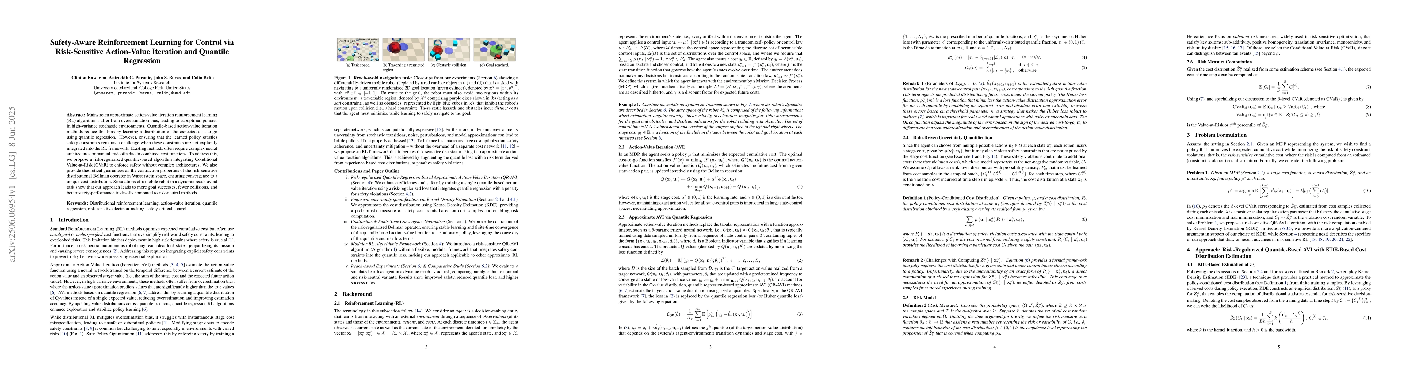 Mainstream approximate action-value iteration reinforcement learning (RL) algorithms suffer from overestimation bias, leading to suboptimal policies in high-variance stochastic environments. Quantile-based action-value iteration methods reduce this bias by learning a distribution of the expected cost-to-go using quantile regression. However, ensuring that the learned policy satisfies safety constraints remains a challenge when these constraints are not explicitly integrated into the RL framework. Existing methods often require complex neural architectures or manual tradeoffs due to combined cost functions. To address this, we propose a risk-regularized quantile-based algorithm integrating Conditional Value-at-Risk (CVaR) to enforce safety without complex architectures. We also provide theoretical guarantees on the contraction properties of the risk-sensitive distributional Bellman operator in Wasserstein space, ensuring convergence to a unique cost distribution. Simulations of a mobile robot in a dynamic reach-avoid task show that our approach leads to more goal successes, fewer collisions, and better safety-performance trade-offs compared to risk-neutral methods.