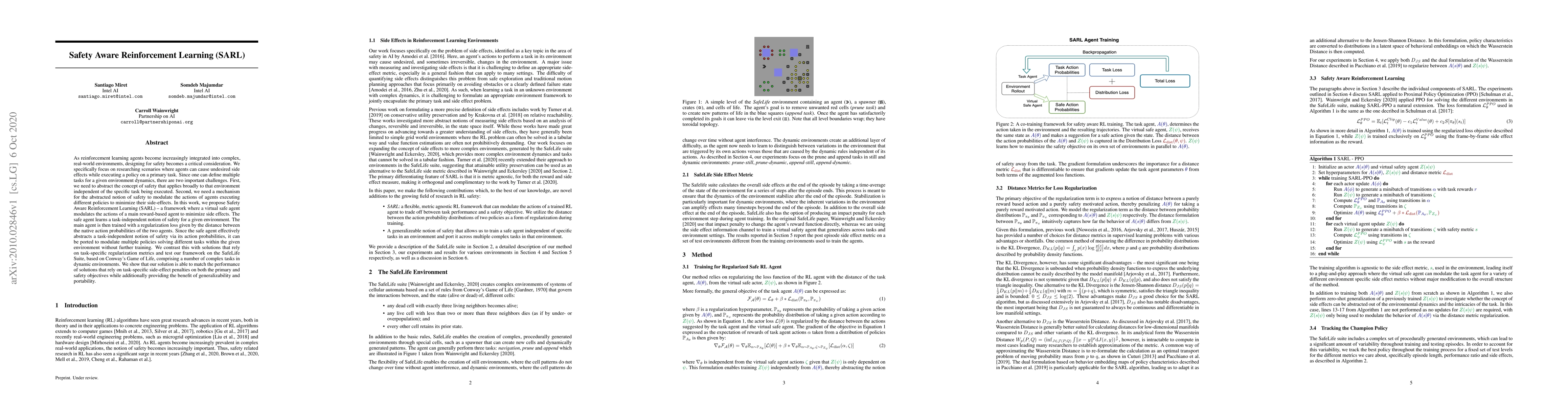 This research paper proposes Safety Aware Reinforcement Learning (SARL) to minimize side effects in complex environments by using a virtual safe agent that modulates the actions of a main reward-based agent.