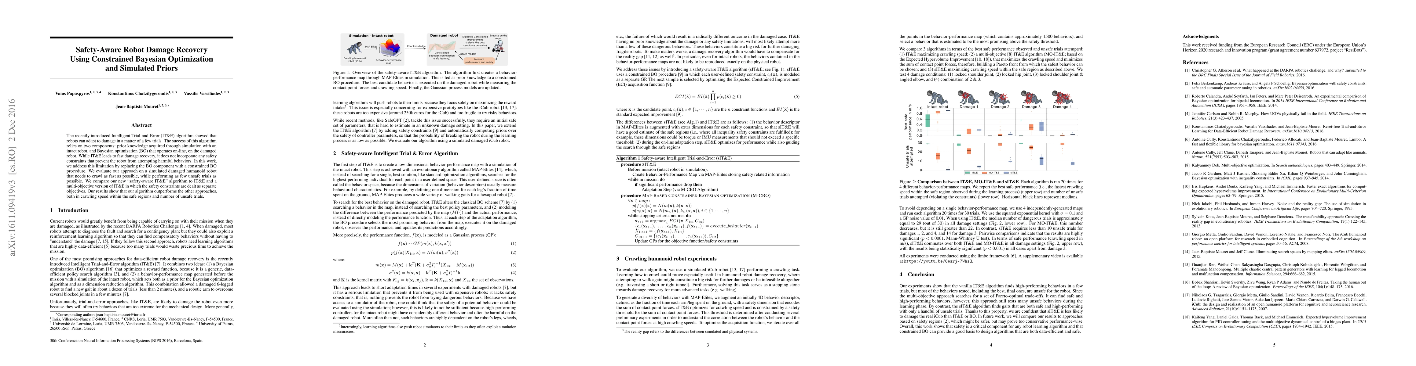 The recently introduced Intelligent Trial-and-Error (IT&E) algorithm showed that robots can adapt to damage in a matter of a few trials. The success of this algorithm relies on two components: prior knowledge acquired through simulation with an intact robot, and Bayesian optimization (BO) that operates on-line, on the damaged robot. While IT&E leads to fast damage recovery, it does not incorporate any safety constraints that prevent the robot from attempting harmful behaviors. In this work, we address this limitation by replacing the BO component with a constrained BO procedure. We evaluate our approach on a simulated damaged humanoid robot that needs to crawl as fast as possible, while performing as few unsafe trials as possible. We compare our new "safety-aware IT&E" algorithm to IT&E and a multi-objective version of IT&E in which the safety constraints are dealt as separate objectives. Our results show that our algorithm outperforms the other approaches, both in crawling speed within the safe regions and number of unsafe trials.