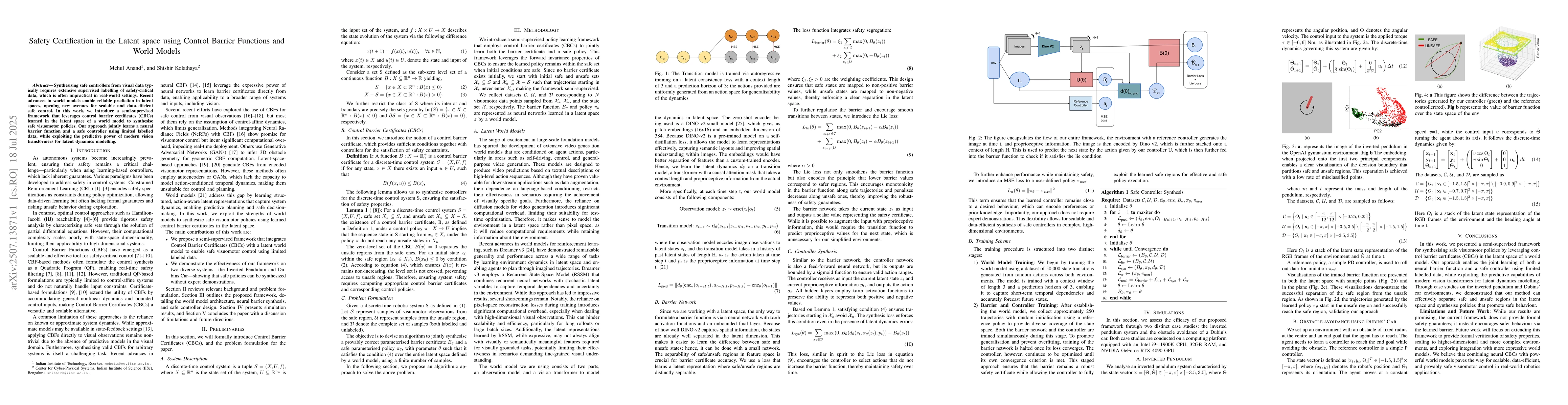 Synthesising safe controllers from visual data typically requires extensive supervised labelling of safety-critical data, which is often impractical in real-world settings. Recent advances in world models enable reliable prediction in latent spaces, opening new avenues for scalable and data-efficient safe control. In this work, we introduce a semi-supervised framework that leverages control barrier certificates (CBCs) learned in the latent space of a world model to synthesise safe visuomotor policies. Our approach jointly learns a neural barrier function and a safe controller using limited labelled data, while exploiting the predictive power of modern vision transformers for latent dynamics modelling.