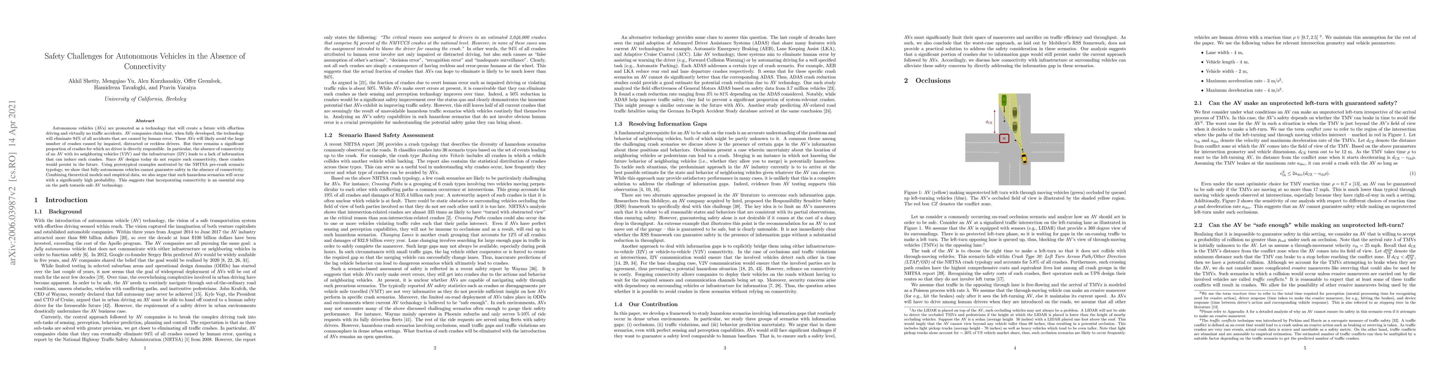 Autonomous vehicles (AVs) are promoted as a technology that will create a future with effortless driving and virtually no traffic accidents. AV companies claim that, when fully developed, the technology will eliminate 94% of all accidents that are caused by human error. These AVs will likely avoid the large number of crashes caused by impaired, distracted or reckless drivers. But there remains a significant proportion of crashes for which no driver is directly responsible. In particular, the absence of connectivity of an AV with its neighboring vehicles (V2V) and the infrastructure (I2V) leads to a lack of information that can induce such crashes. Since AV designs today do not require such connectivity, these crashes would persist in the future. Using prototypical examples motivated by the NHTSA pre-crash scenario typology, we show that fully autonomous vehicles cannot guarantee safety in the absence of connectivity. Combining theoretical models and empirical data, we also argue that such hazardous scenarios will occur with a significantly high probability. This suggests that incorporating connectivity is an essential step on the path towards safe AV technology.