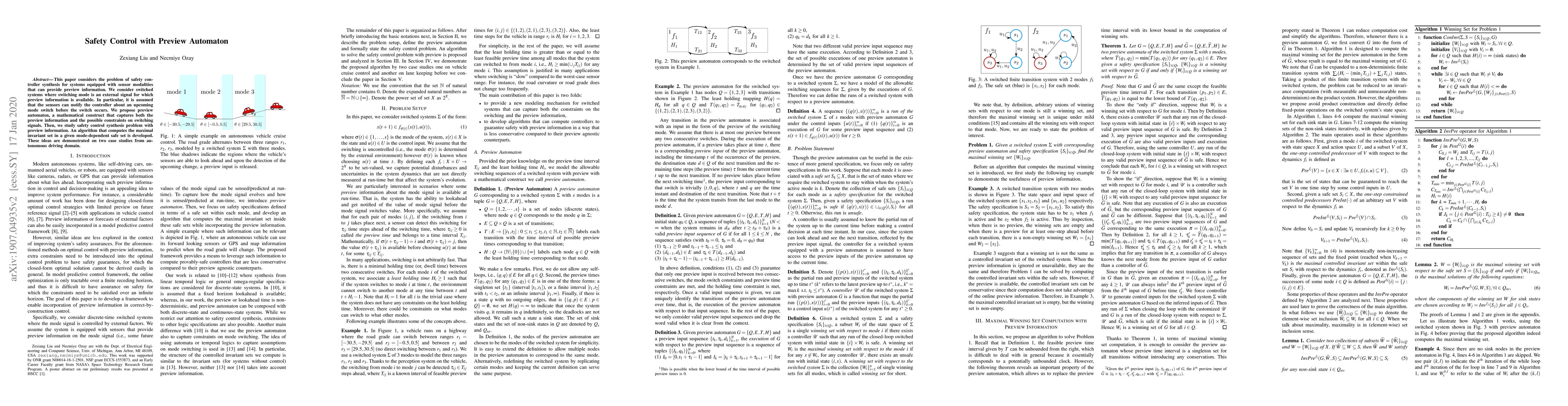 This paper proposes a preview automaton to synthesize safety controllers for switched systems using preview information from sensors. An algorithm is developed to compute the maximal invariant set within mode-dependent safe sets, demonstrated through autonomous driving case studies.