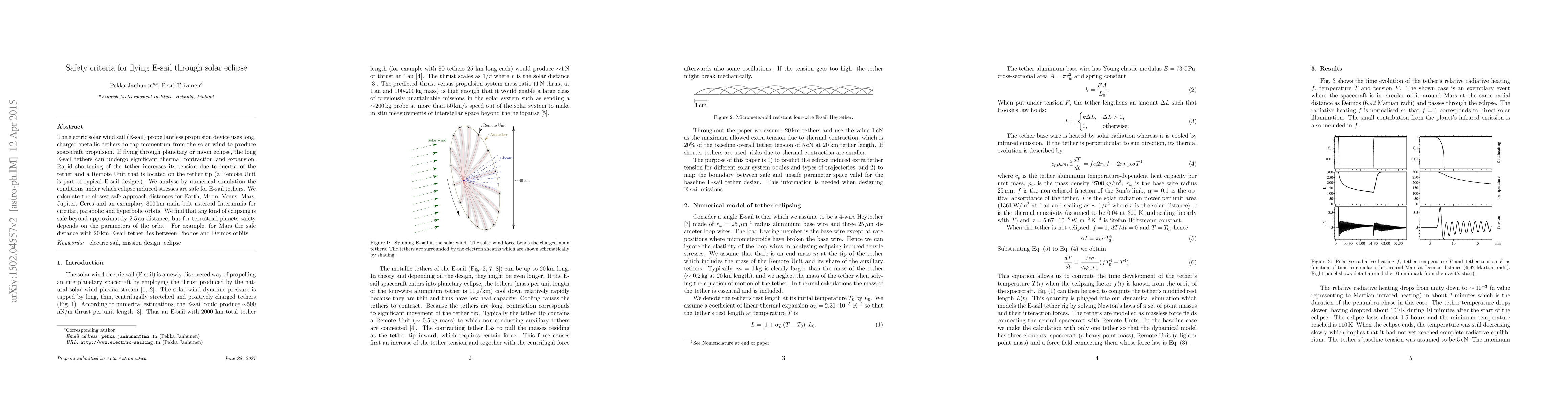 This paper investigates the safety criteria for using electric solar wind sails (E-sails) during planetary or moon eclipses, analyzing tether stress through numerical simulations. It finds that beyond 2.5 au, eclipsing is safe, but for terrestrial planets like Mars, safety depends on orbital parameters, with a safe tether distance lying between the orbits of Phobos and Deimos.
