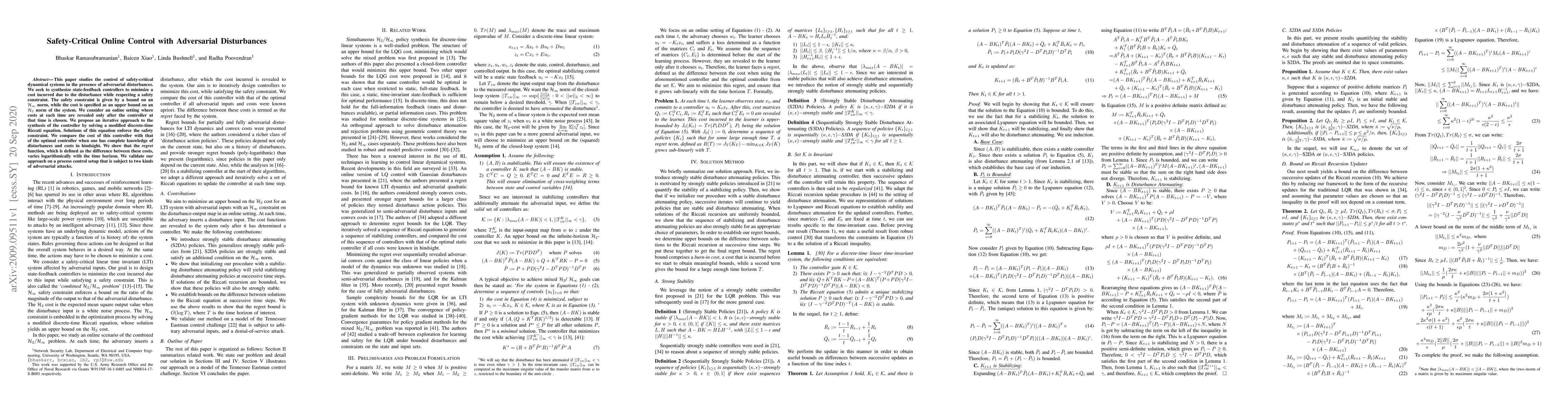 This paper studies the control of safety-critical dynamical systems in the presence of adversarial disturbances. We seek to synthesize state-feedback controllers to minimize a cost incurred due to the disturbance, while respecting a safety constraint. The safety constraint is given by a bound on an H-inf norm, while the cost is specified as an upper bound on the H-2 norm of the system. We consider an online setting where costs at each time are revealed only after the controller at that time is chosen. We propose an iterative approach to the synthesis of the controller by solving a modified discrete-time Riccati equation. Solutions of this equation enforce the safety constraint. We compare the cost of this controller with that of the optimal controller when one has complete knowledge of disturbances and costs in hindsight. We show that the regret function, which is defined as the difference between these costs, varies logarithmically with the time horizon. We validate our approach on a process control setup that is subject to two kinds of adversarial attacks.