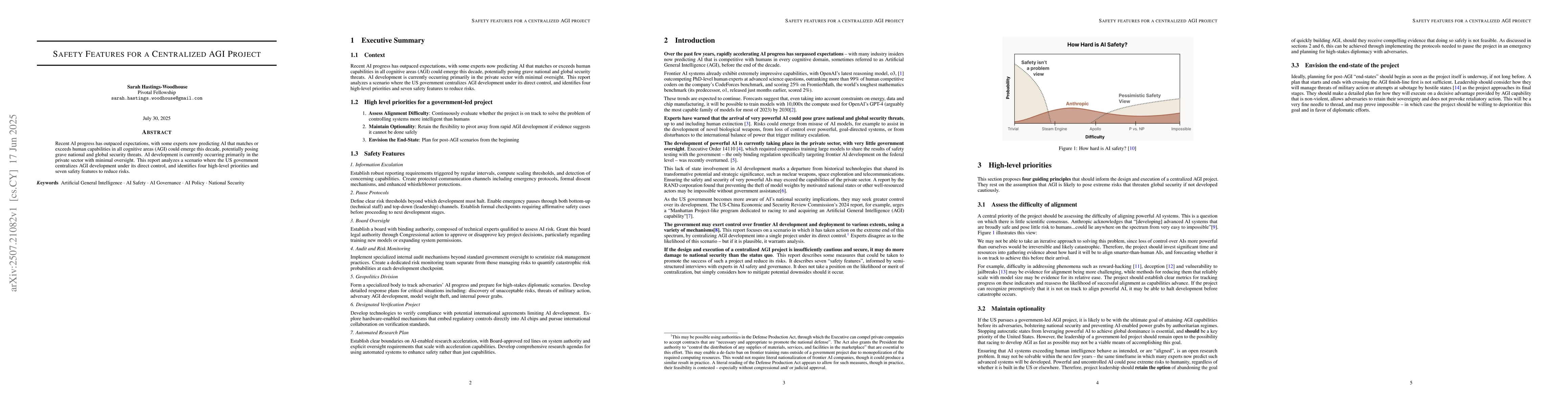 Recent AI progress has outpaced expectations, with some experts now predicting AI that matches or exceeds human capabilities in all cognitive areas (AGI) could emerge this decade, potentially posing grave national and global security threats. AI development is currently occurring primarily in the private sector with minimal oversight. This report analyzes a scenario where the US government centralizes AGI development under its direct control, and identifies four high-level priorities and seven safety features to reduce risks.