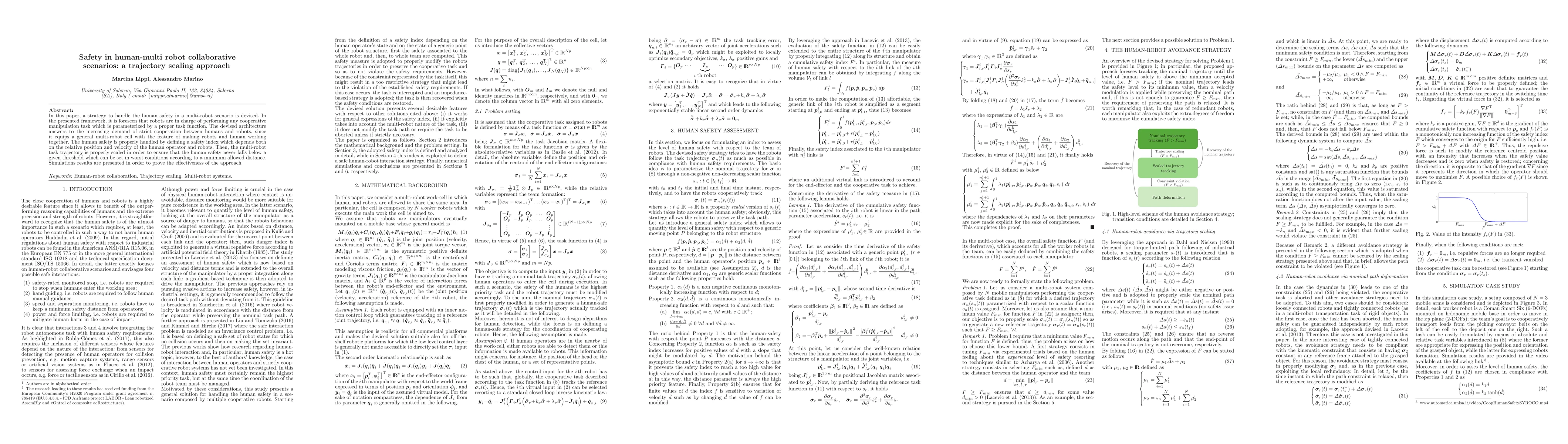 In this paper, a strategy to handle the human safety in a multi-robot scenario is devised. In the presented framework, it is foreseen that robots are in charge of performing any cooperative manipulation task which is parameterized by a proper task function. The devised architecture answers to the increasing demand of strict cooperation between humans and robots, since it equips a general multi-robot cell with the feature of making robots and human working together. The human safety is properly handled by defining a safety index which depends both on the relative position and velocity of the human operator and robots. Then, the multi-robot task trajectory is properly scaled in order to ensure that the human safety never falls below a given threshold which can be set in worst conditions according to a minimum allowed distance. Simulations results are presented in order to prove the effectiveness of the approach.