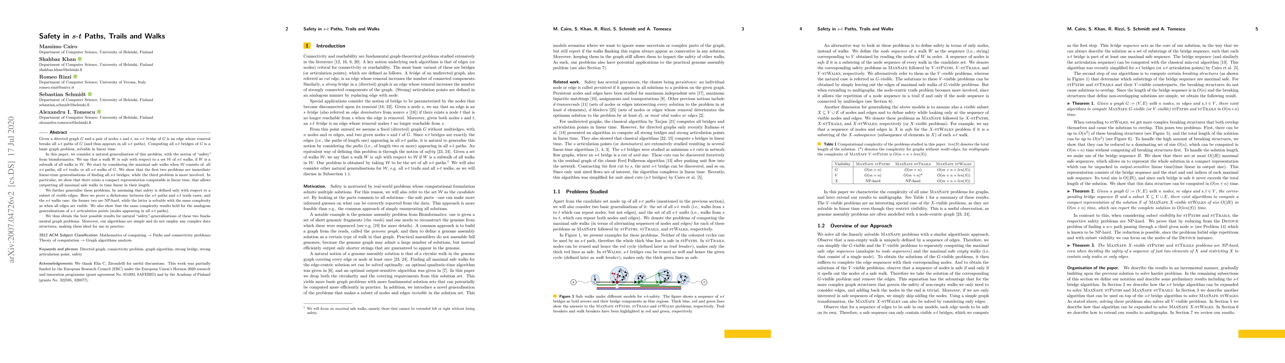 Researchers solved key graph problems with a new concept called safety, which determines if a walk is part of all possible s-t paths, trails, or walks in a directed graph, achieving linear-time solutions for some cases and showing NP-hardness for others.