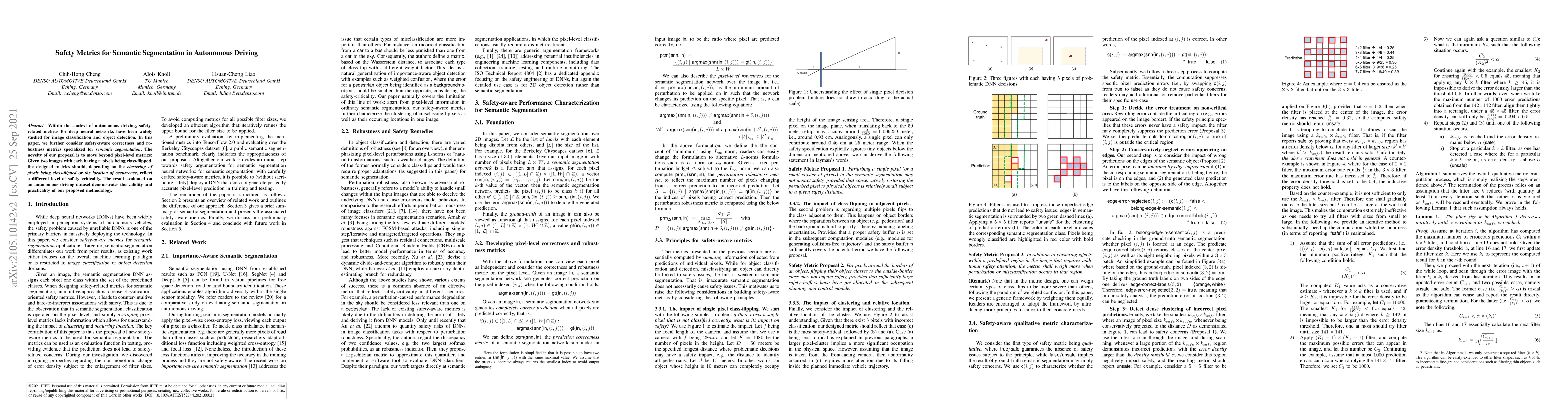 This paper proposes novel safety-aware metrics for semantic segmentation in autonomous driving, moving beyond pixel-level metrics to consider the clustering and location of class-flipped pixels for assessing safety criticality. The effectiveness of the proposed methodology is validated through evaluation on an autonomous driving dataset.