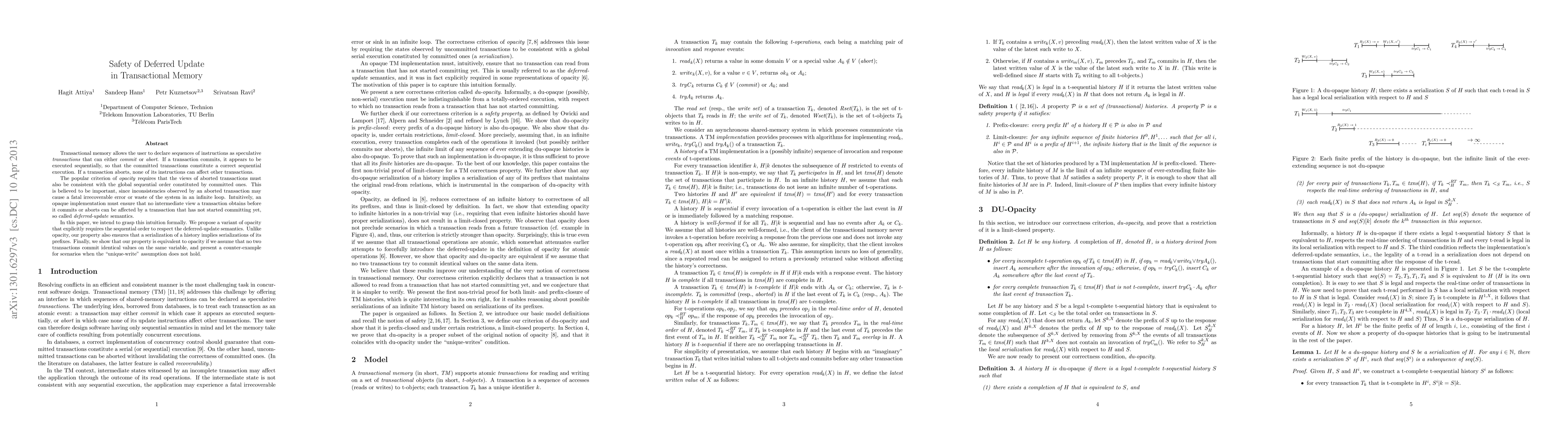 This paper proposes a variant of opacity for transactional memory that ensures deferred-update semantics, demonstrating that this criterion is a safety property. It shows that this property is equivalent to opacity under the "unique-write" assumption but provides a counter-example when this assumption fails.