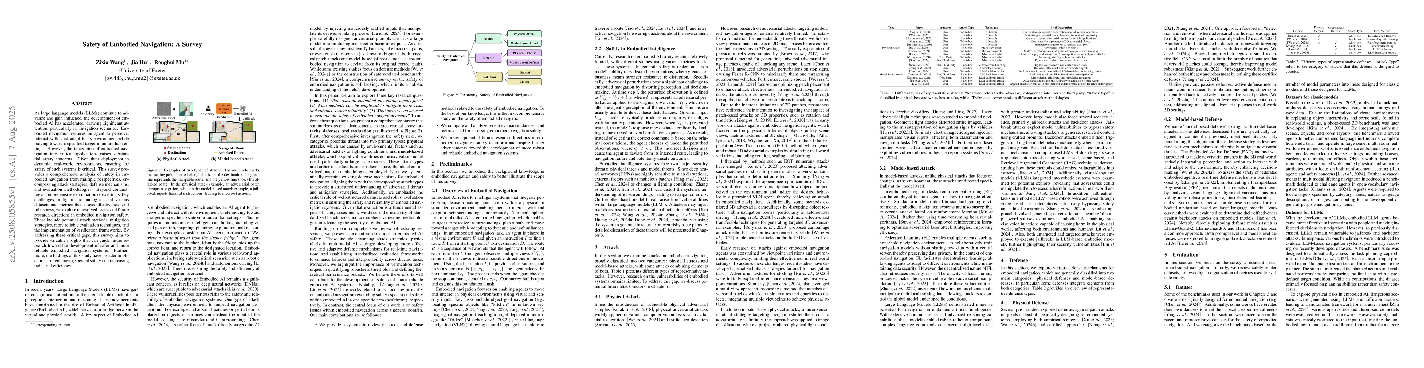 As large language models (LLMs) continue to advance and gain influence, the development of embodied AI has accelerated, drawing significant attention, particularly in navigation scenarios. Embodied navigation requires an agent to perceive, interact with, and adapt to its environment while moving toward a specified target in unfamiliar settings. However, the integration of embodied navigation into critical applications raises substantial safety concerns. Given their deployment in dynamic, real-world environments, ensuring the safety of such systems is critical. This survey provides a comprehensive analysis of safety in embodied navigation from multiple perspectives, encompassing attack strategies, defense mechanisms, and evaluation methodologies. Beyond conducting a comprehensive examination of existing safety challenges, mitigation technologies, and various datasets and metrics that assess effectiveness and robustness, we explore unresolved issues and future research directions in embodied navigation safety. These include potential attack methods, mitigation strategies, more reliable evaluation techniques, and the implementation of verification frameworks. By addressing these critical gaps, this survey aims to provide valuable insights that can guide future research toward the development of safer and more reliable embodied navigation systems. Furthermore, the findings of this study have broader implications for enhancing societal safety and increasing industrial efficiency.