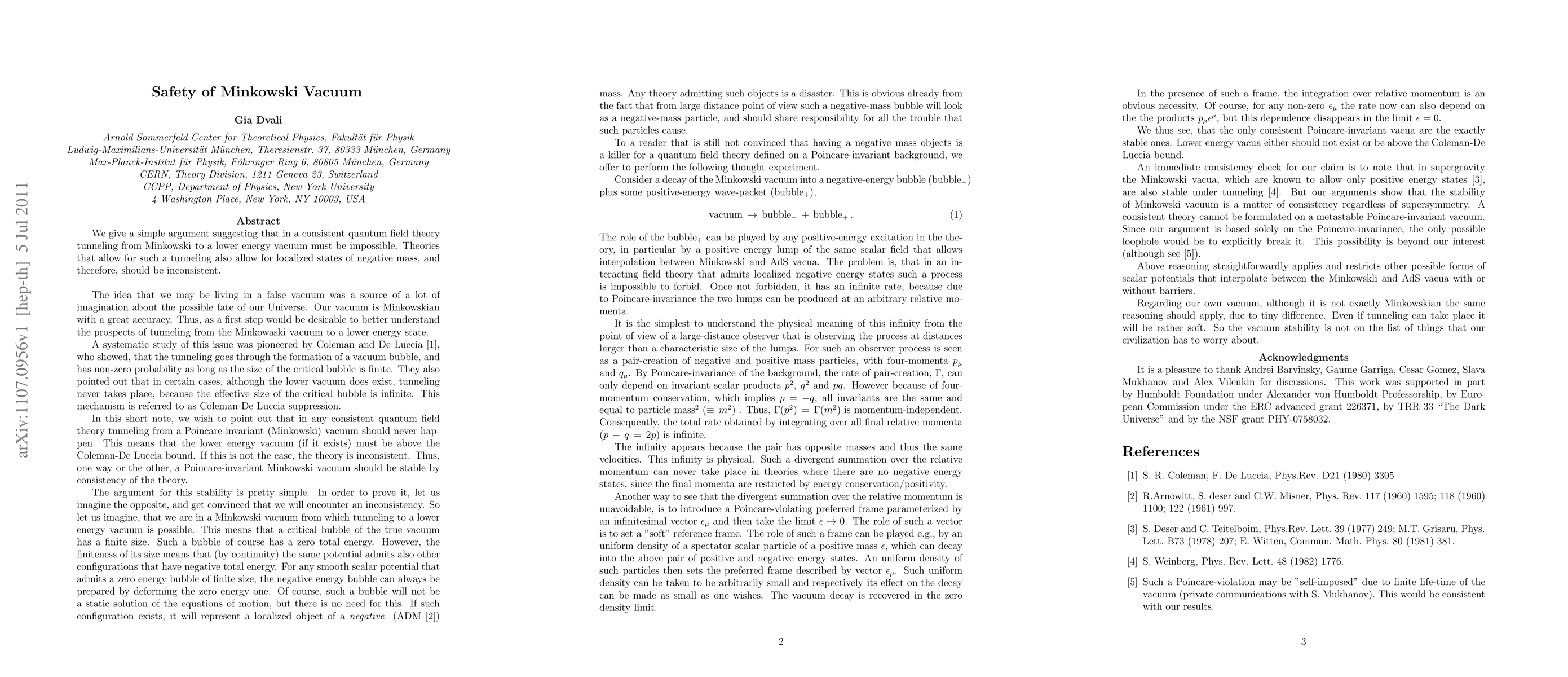 We give a simple argument suggesting that in a consistent quantum field theory tunneling from Minkowski to a lower energy vacuum must be impossible. Theories that allow for such a tunneling also allow for localized states of negative mass, and therefore, should be inconsistent.