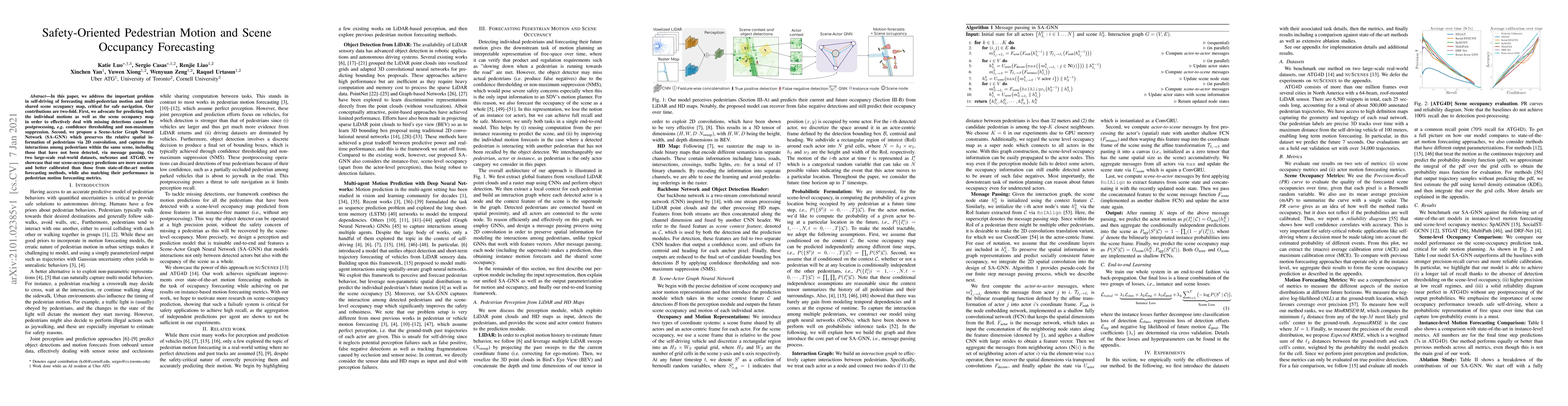 This paper proposes a method for forecasting pedestrian motion and scene occupancy in self-driving, using a Scene-Actor Graph Neural Network (SA-GNN) that predicts individual motions and shared scene occupancy to handle missing detections. The method outperforms state-of-the-art in scene-occupancy predictions on two datasets.