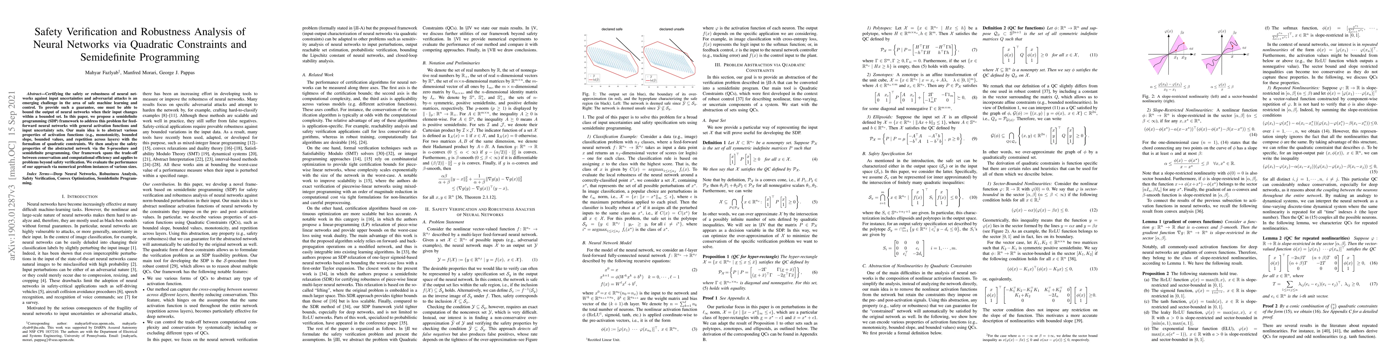 This paper proposes a semidefinite programming framework to certify the safety and robustness of neural networks against input uncertainties using quadratic constraints. The method abstracts properties of activation functions and applies the S-procedure and semidefinite programming to analyze network safety, balancing conservatism and computational efficiency.