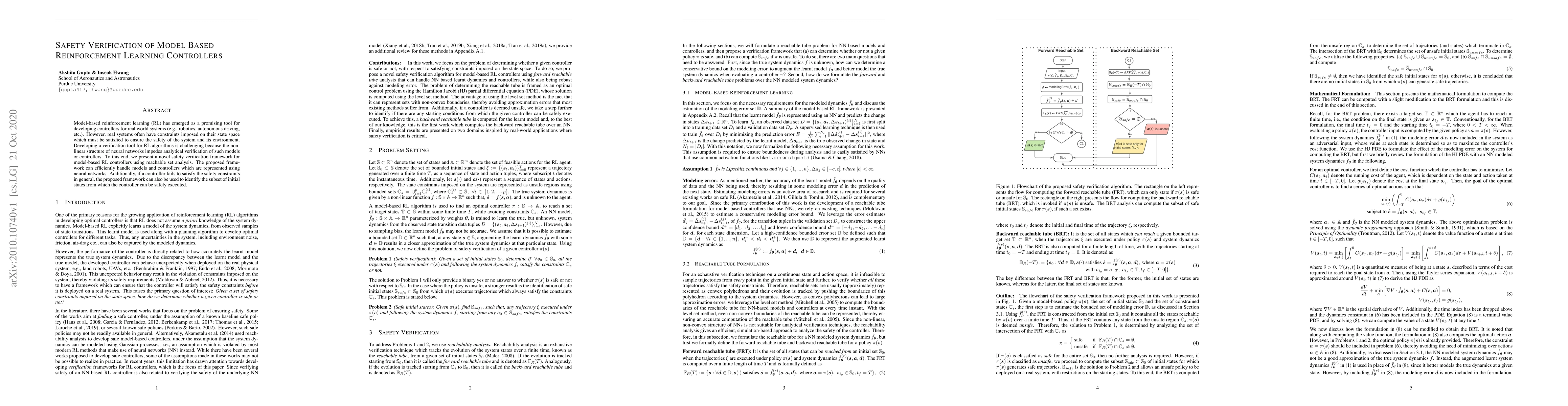 This paper introduces a novel safety verification framework for model-based reinforcement learning controllers employing reachable set analysis to ensure system safety. The framework effectively handles neural network representations and identifies unsafe initial states when safety constraints are not met.