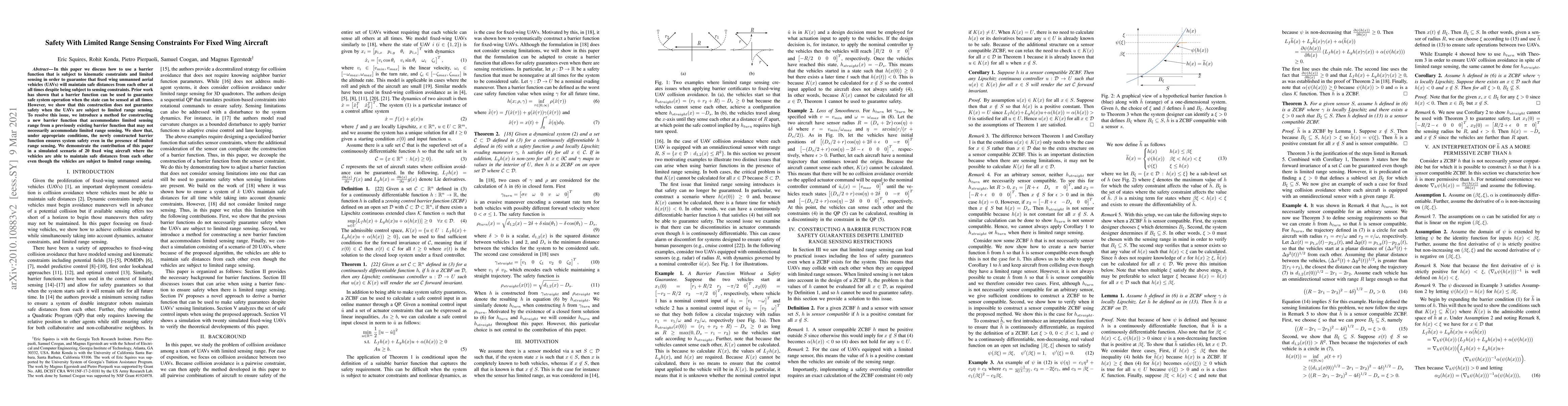 In this paper we discuss how to use a barrier function that is subject to kinematic constraints and limited sensing in order to guarantee that fixed wing unmanned aerial vehicles (UAVs) will maintain safe distances from each other at all times despite being subject to limited range sensing constraints. Prior work has shown that a barrier function can be used to guarantee safe system operation when the state can be sensed at all times. However, in this paper we show that this construction does not guarantee safety when the UAVs are subject to limited range sensing. To resolve this issue, we introduce a method for constructing a new barrier function that accommodates limited sensing range from a previously existing barrier function that may not necessarily accommodate limited range sensing. We show that, under appropriate conditions, the newly constructed barrier function ensures system safety even in the presence of limited range sensing. We demonstrate the contribution of this paper in a scenario of 20 fixed wing aircraft, where because of the proposed algorithm, the vehicles are able to maintain safe distances from each other even though the vehicles are subject to limited range sensing.