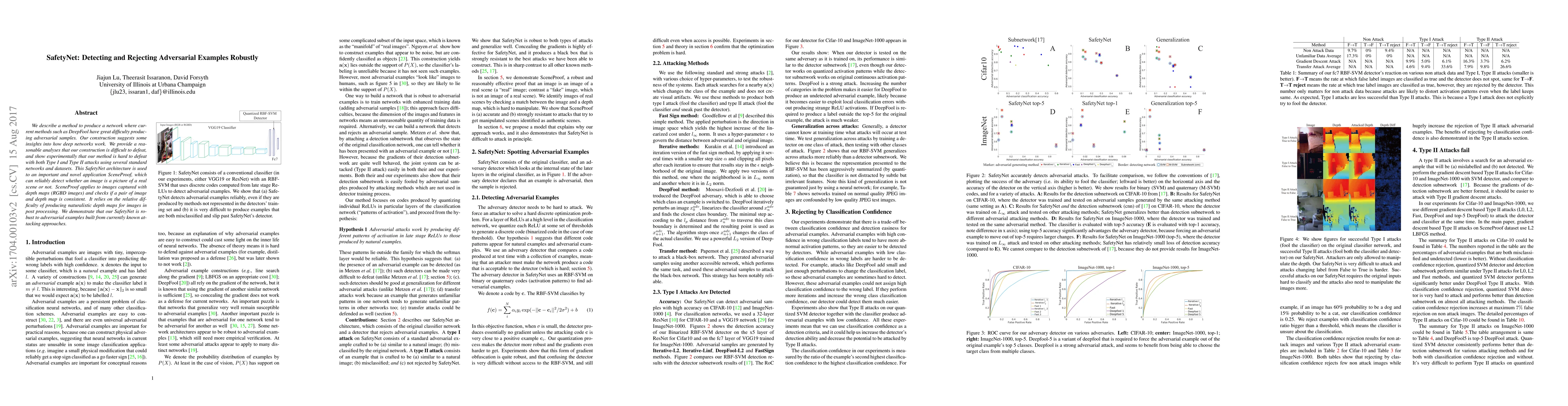 We describe a method to produce a network where current methods such as DeepFool have great difficulty producing adversarial samples. Our construction suggests some insights into how deep networks work. We provide a reasonable analyses that our construction is difficult to defeat, and show experimentally that our method is hard to defeat with both Type I and Type II attacks using several standard networks and datasets. This SafetyNet architecture is used to an important and novel application SceneProof, which can reliably detect whether an image is a picture of a real scene or not. SceneProof applies to images captured with depth maps (RGBD images) and checks if a pair of image and depth map is consistent. It relies on the relative difficulty of producing naturalistic depth maps for images in post processing. We demonstrate that our SafetyNet is robust to adversarial examples built from currently known attacking approaches.