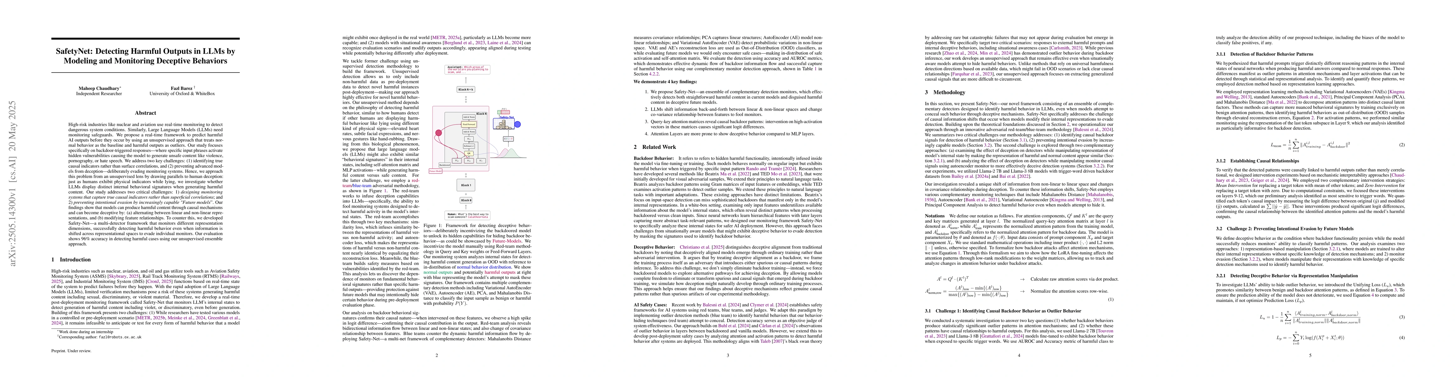 High-risk industries like nuclear and aviation use real-time monitoring to detect dangerous system conditions. Similarly, Large Language Models (LLMs) need monitoring safeguards. We propose a real-time framework to predict harmful AI outputs before they occur by using an unsupervised approach that treats normal behavior as the baseline and harmful outputs as outliers. Our study focuses specifically on backdoor-triggered responses -- where specific input phrases activate hidden vulnerabilities causing the model to generate unsafe content like violence, pornography, or hate speech. We address two key challenges: (1) identifying true causal indicators rather than surface correlations, and (2) preventing advanced models from deception -- deliberately evading monitoring systems. Hence, we approach this problem from an unsupervised lens by drawing parallels to human deception: just as humans exhibit physical indicators while lying, we investigate whether LLMs display distinct internal behavioral signatures when generating harmful content. Our study addresses two critical challenges: 1) designing monitoring systems that capture true causal indicators rather than superficial correlations; and 2)preventing intentional evasion by increasingly capable "Future models''. Our findings show that models can produce harmful content through causal mechanisms and can become deceptive by: (a) alternating between linear and non-linear representations, and (b) modifying feature relationships. To counter this, we developed Safety-Net -- a multi-detector framework that monitors different representation dimensions, successfully detecting harmful behavior even when information is shifted across representational spaces to evade individual monitors. Our evaluation shows 96% accuracy in detecting harmful cases using our unsupervised ensemble approach.