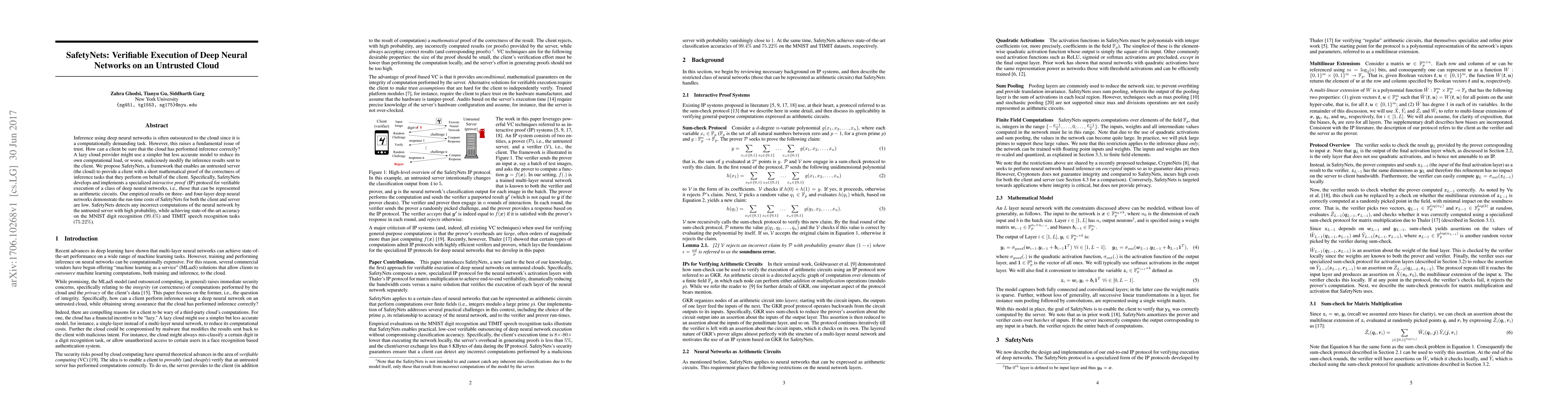 SafetyNets provides a framework for verifiable execution of deep neural networks on an untrusted cloud, offering clients a mathematical proof of correct inference. It employs an interactive proof protocol to detect any incorrect computations with high probability, achieving state-of-the-art accuracy on MNIST and TIMIT tasks while maintaining low run-time costs.