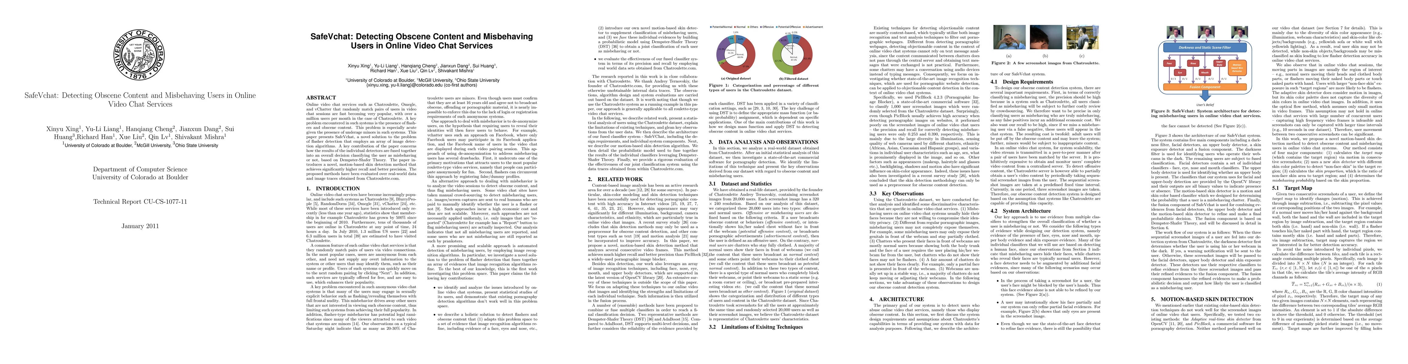 SafeVchat addresses the issue of obscene content and misbehaving users in online video chat services by employing advanced image detection algorithms and fusing their results using Dempster-Shafer Theory. The system also introduces a novel motion-based skin detection method, achieving higher recall and precision, validated through real-world data from platforms like Chatroulette.