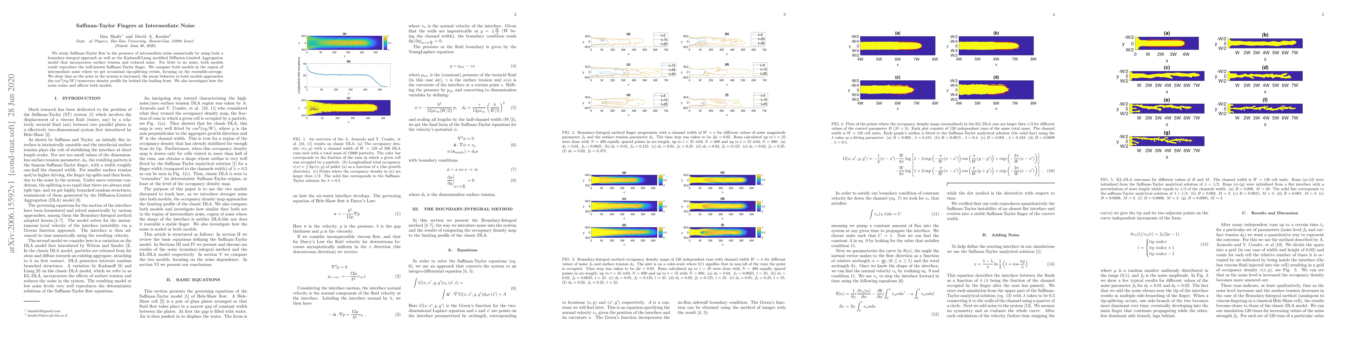 This paper numerically investigates Saffman-Taylor flow under intermediate noise using boundary-integral and Kadanoff-Liang models, showing that both reproduce the classic finger pattern with little noise. It reveals that increased noise leads to a mean transverse density profile resembling $\cos^2(\pi y/W)$ and examines the scaling effects of noise on the models.