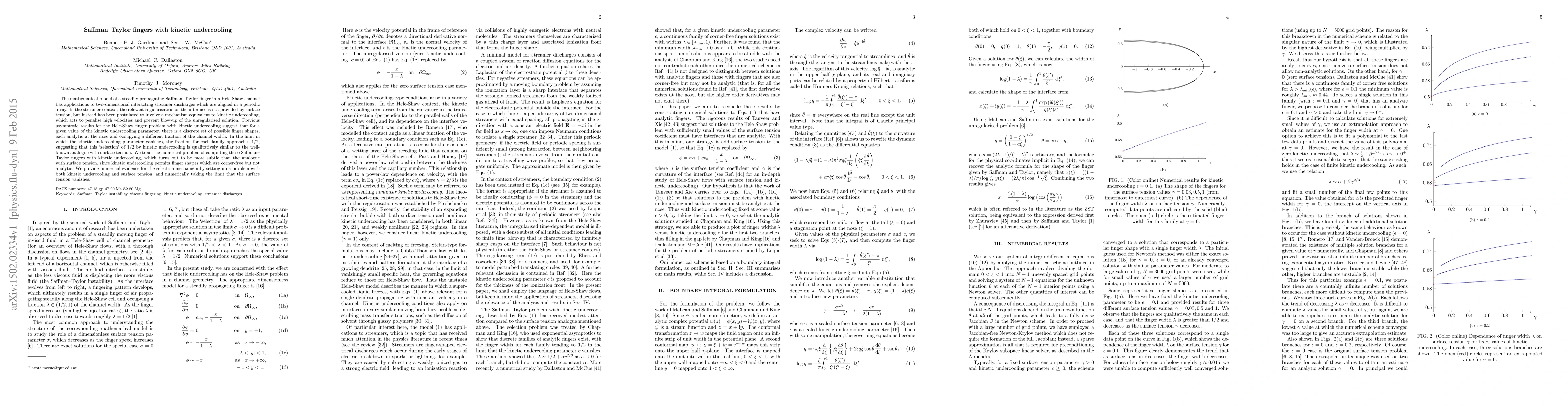 This paper explores the mathematical model of Saffman-Taylor fingers in a Hele-Shaw channel with kinetic undercooling, which regulates finger propagation by penalizing high velocities. It provides numerical evidence for the selection of specific finger shapes, analogous to surface tension effects, and highlights the complexities introduced by kinetic undercooling compared to traditional models.