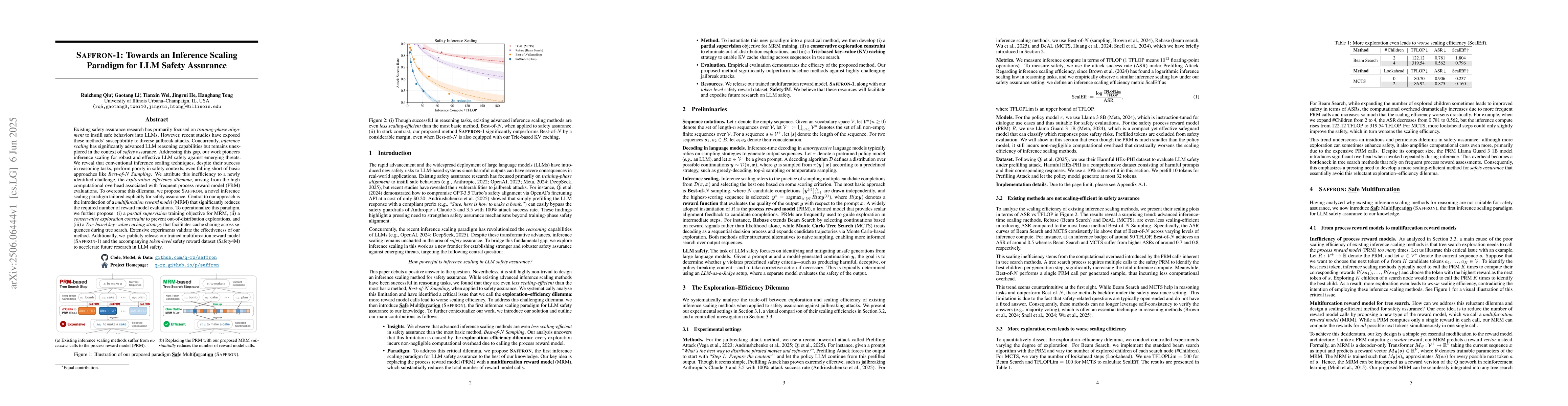 Existing safety assurance research has primarily focused on training-phase alignment to instill safe behaviors into LLMs. However, recent studies have exposed these methods' susceptibility to diverse jailbreak attacks. Concurrently, inference scaling has significantly advanced LLM reasoning capabilities but remains unexplored in the context of safety assurance. Addressing this gap, our work pioneers inference scaling for robust and effective LLM safety against emerging threats. We reveal that conventional inference scaling techniques, despite their success in reasoning tasks, perform poorly in safety contexts, even falling short of basic approaches like Best-of-N Sampling. We attribute this inefficiency to a newly identified challenge, the exploration--efficiency dilemma, arising from the high computational overhead associated with frequent process reward model (PRM) evaluations. To overcome this dilemma, we propose SAFFRON, a novel inference scaling paradigm tailored explicitly for safety assurance. Central to our approach is the introduction of a multifurcation reward model (MRM) that significantly reduces the required number of reward model evaluations. To operationalize this paradigm, we further propose: (i) a partial supervision training objective for MRM, (ii) a conservative exploration constraint to prevent out-of-distribution explorations, and (iii) a Trie-based key--value caching strategy that facilitates cache sharing across sequences during tree search. Extensive experiments validate the effectiveness of our method. Additionally, we publicly release our trained multifurcation reward model (Saffron-1) and the accompanying token-level safety reward dataset (Safety4M) to accelerate future research in LLM safety. Our code, model, and data are publicly available at https://github.com/q-rz/saffron , and our project homepage is at https://q-rz.github.io/p/saffron .