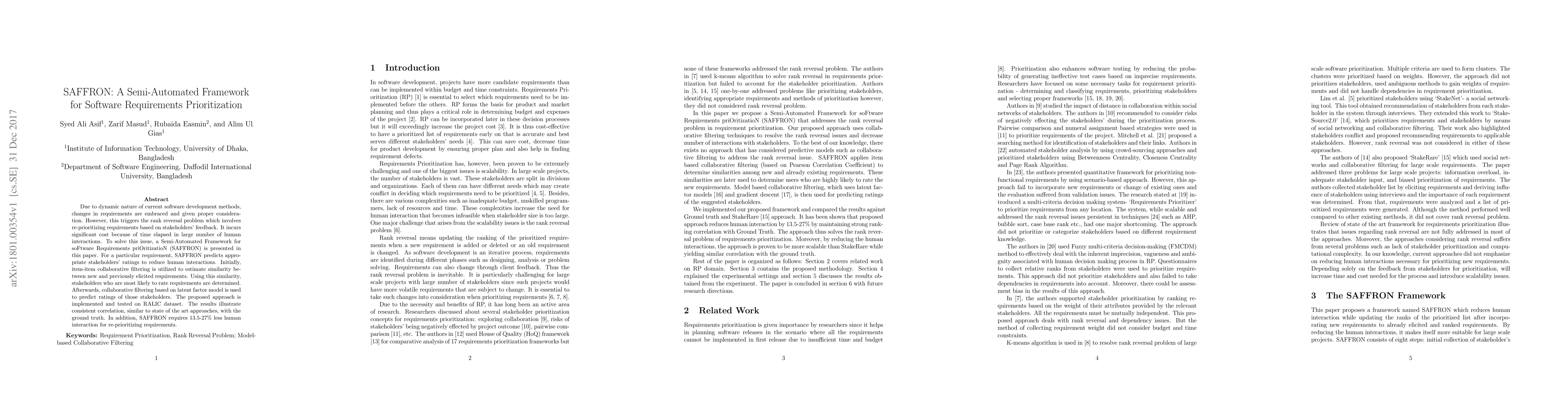 The paper introduces SAFFRON, a Semi-Automated Framework for Software Requirements Prioritization, which uses collaborative filtering to predict stakeholders' ratings and reduce human interactions. The framework shows consistent correlation with ground truth and requires 13.5-27% less human involvement compared to manual prioritization.